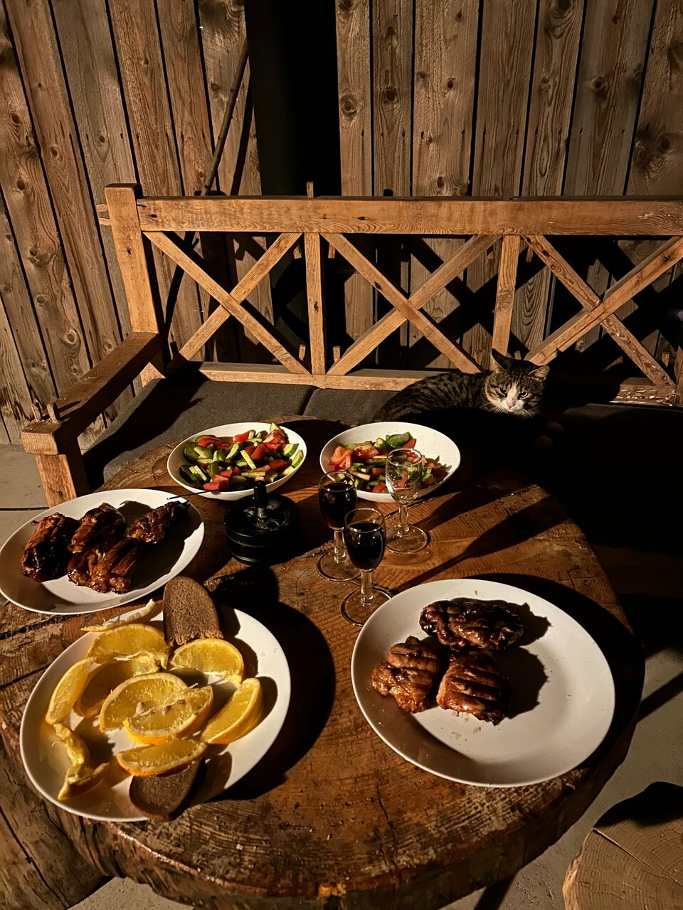 Всё отлично. Питание готовим сами. Обстановка в домиках изысканая, всё со вкусом, интересно. Есть Мангал. Внутри есть маленькая печка. Душ, туалет. Но вокруг пока что Руины. Нужно время. Всё будет хорошо.