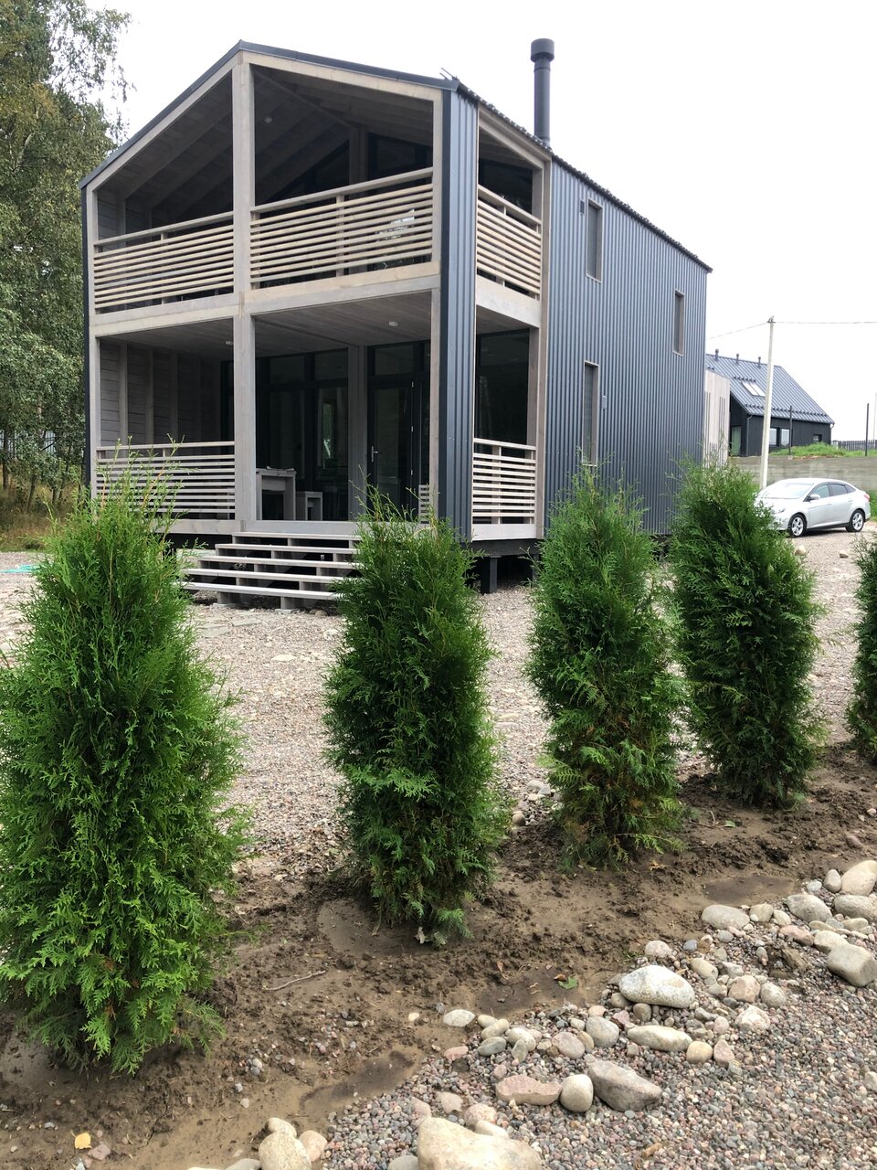 Классные домики. Рядом лес. Закрытая территория. Пока территория странная просто отсыпано камнями.
