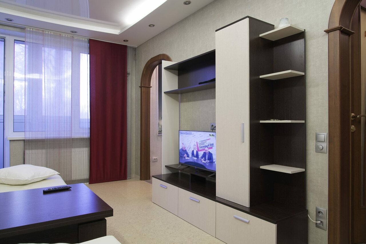 В апартаментах имеются все необходимые удобства для комфортабельного проживания и отдыха: двухспальная кровать, диван, письменный стол, стул, комод, платяной шкаф, телевизор, wi-fi, санузел. Данные апартаменты также сдаются на длительный срок