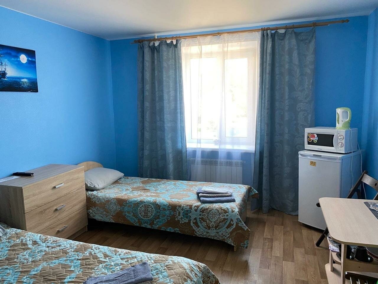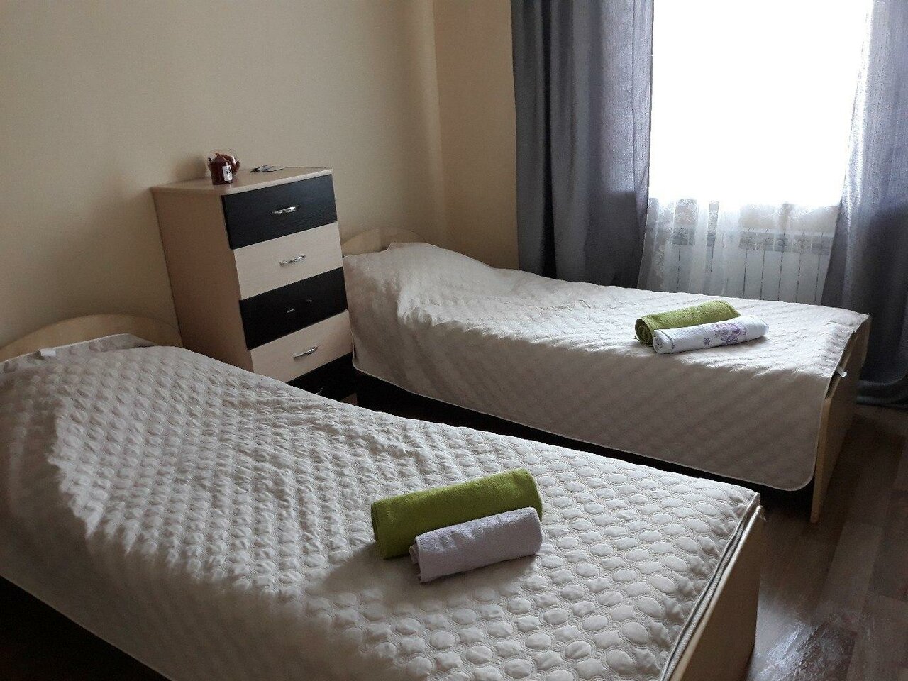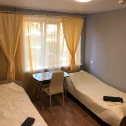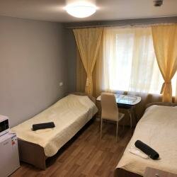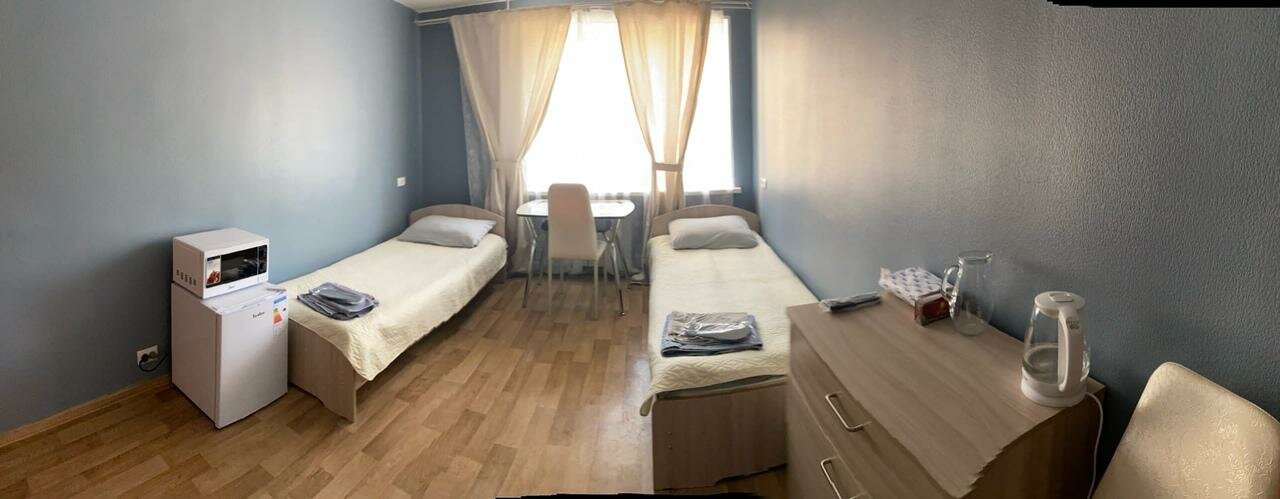 В номере: две односпальные кровати, комод, телевизор, холодильник, СВ печь, бесплатный Wi-Fi. Санузел в номере.
