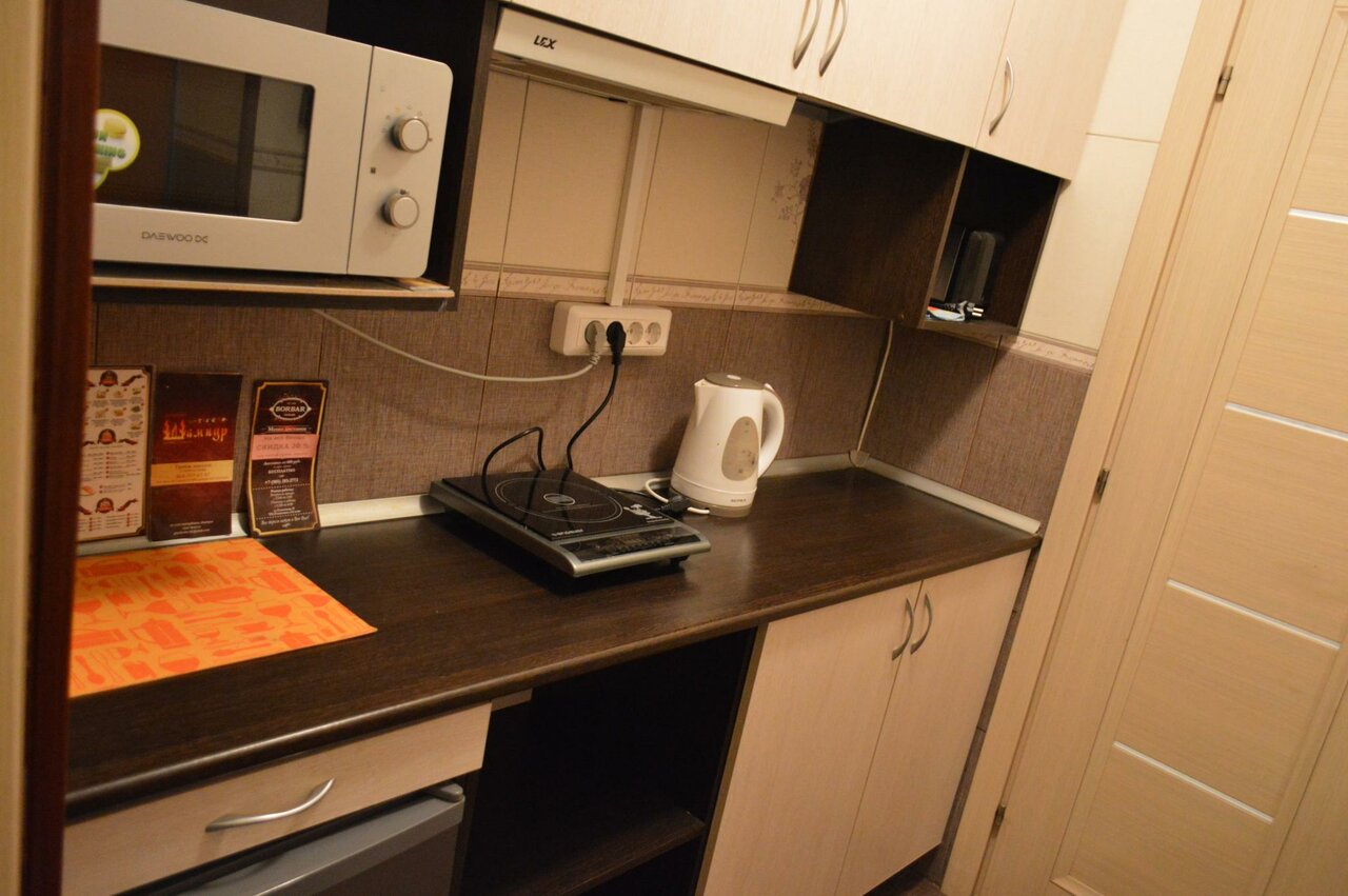 В номере: двуспальная кровать, комод, журнальный стол, шкаф, телевизор, холодильник, электроплита, чайник, микроволновая печь, посуда, бесплатный Wi-Fi. Санузел в номере.