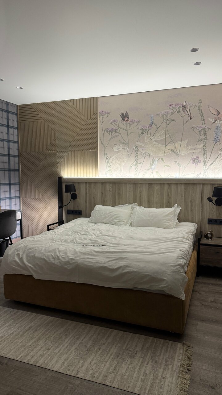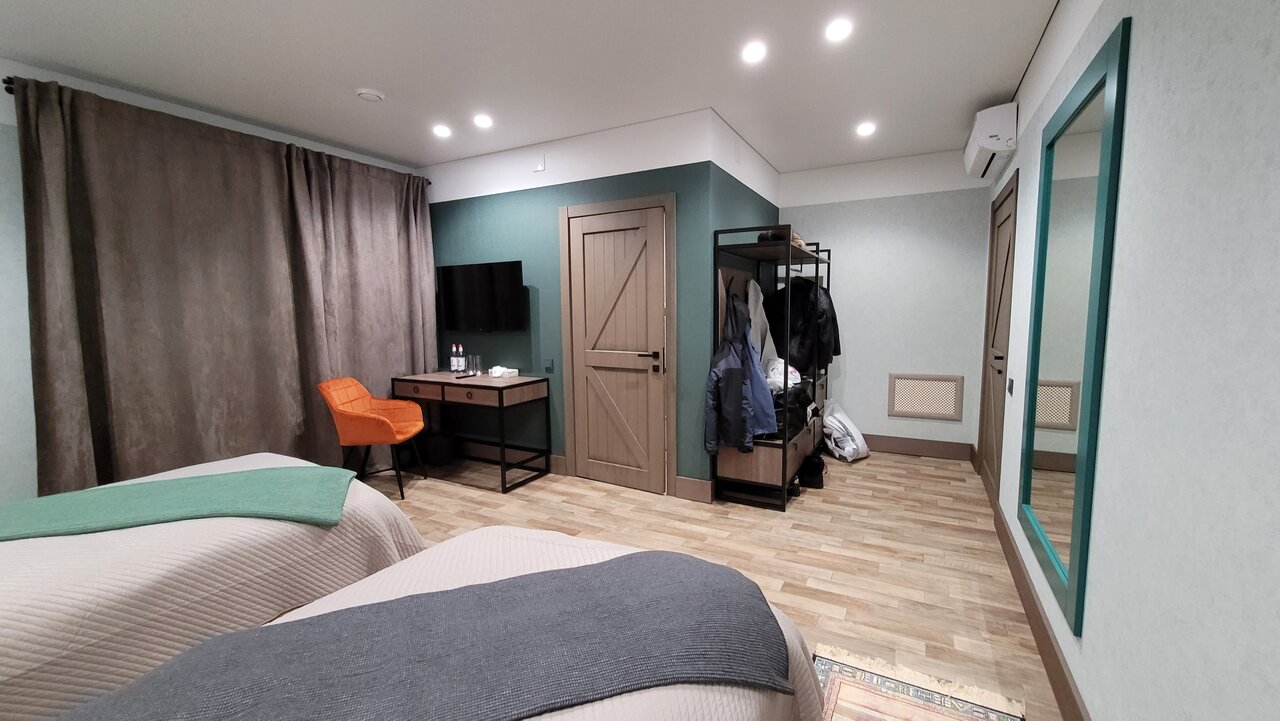 Современный номер с оригинальной дизайнерской отделкой, прекрасно подойдет для размещения, как путешественников, так и тех, кто приезжает по работе. Широкая кровать, шторы блэк-аут и удобная рабочая зона – неотъемлемые атрибуты bleasure-отдыха.
