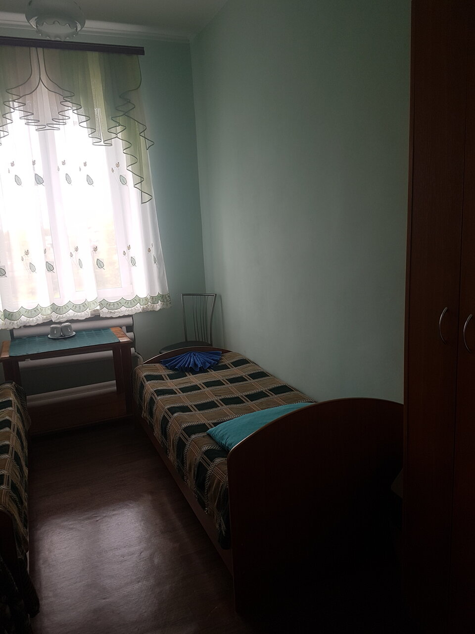 На фото тот самый номер где я останавливался на 3 ночи. Кровать есть, сан узел ж/м раздельно, душ общий для всех, чайник и микроволновка и холодильник тоже 1 шт на всех. Клопов вроде нету. На завтрак дают блины (хорошие). Внизу кафешка, там небыл.