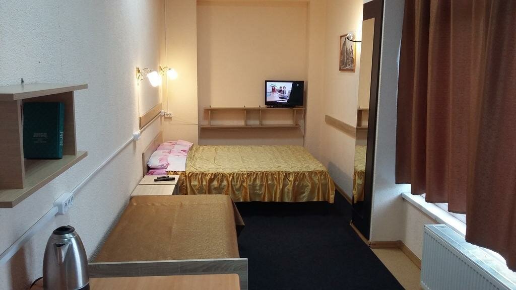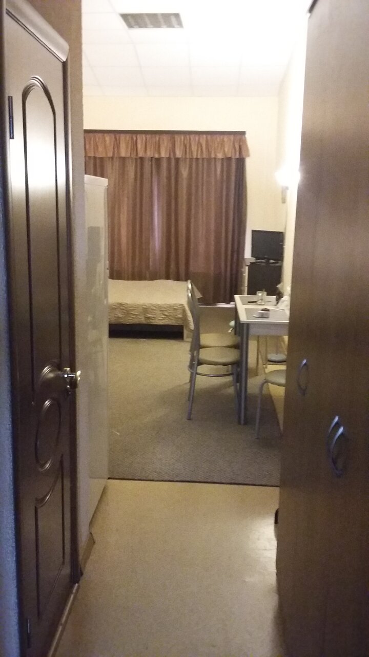 Это достаточно просторный номер со своим санузлом и душем за 1200 (!!!) рублей в сутки за номер на двоих. Во многих городах вы хостел за столько не снимите, а москвичи за такие деньги однушку за МКАДом снимают. А тут номер в гостинице! Из плюсов, наверное всё. На двери номера имеются следы взлома, из-за этого при запирании на один оборот дверь остаётся не запертой. Лифта нет. В номере чисто.