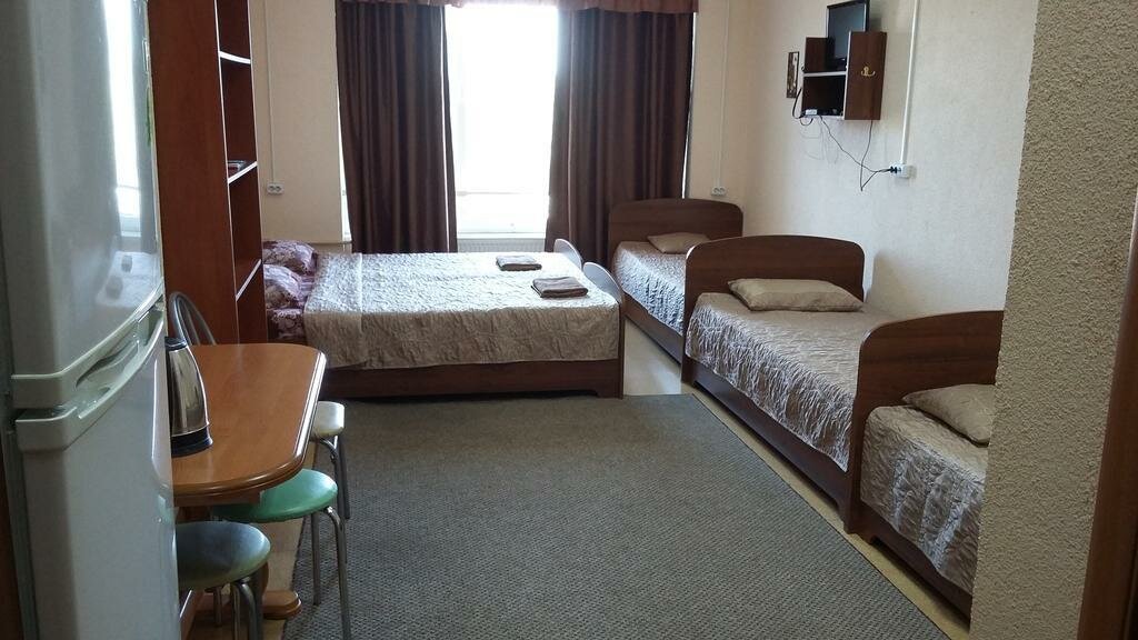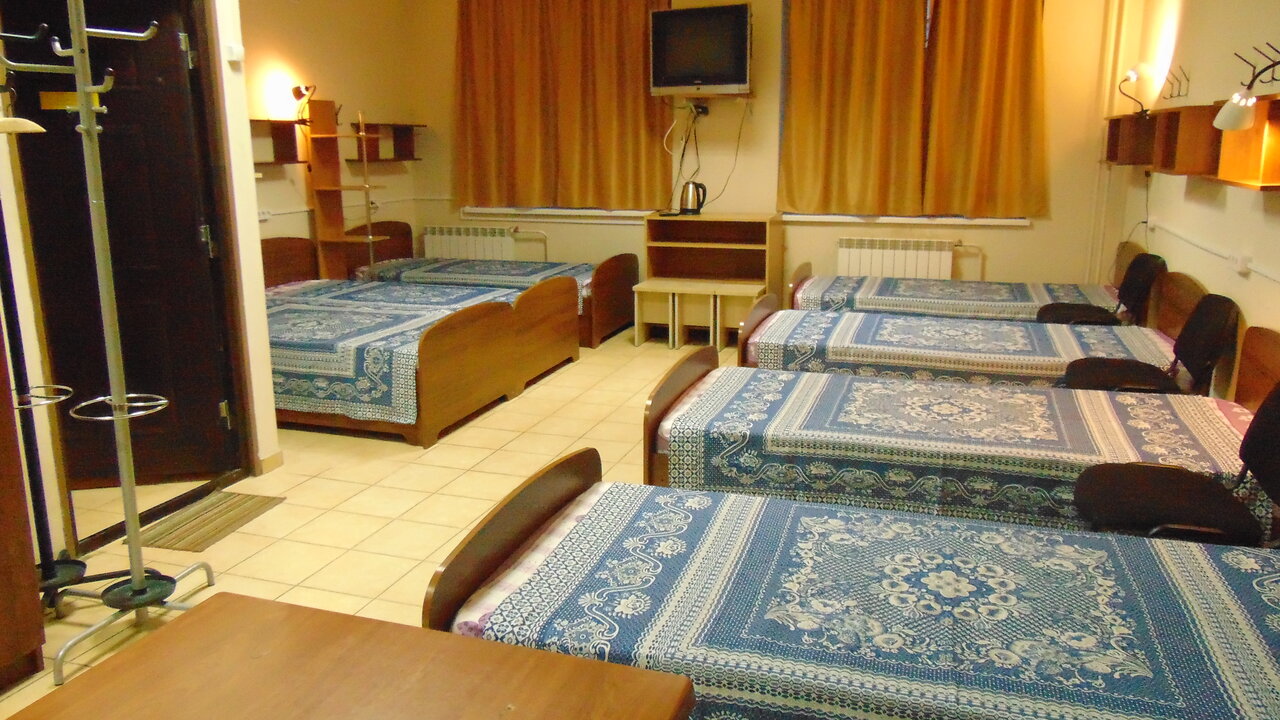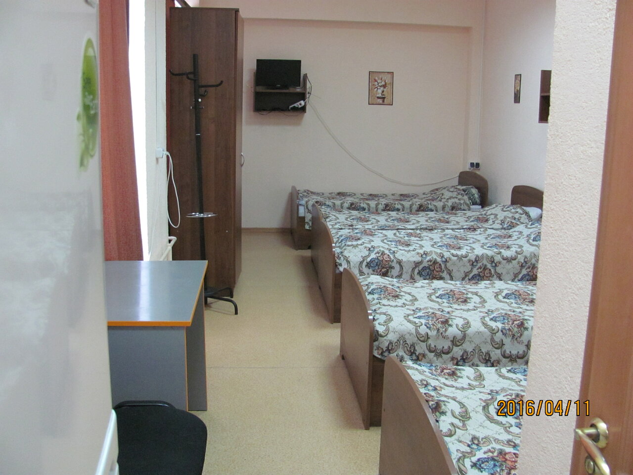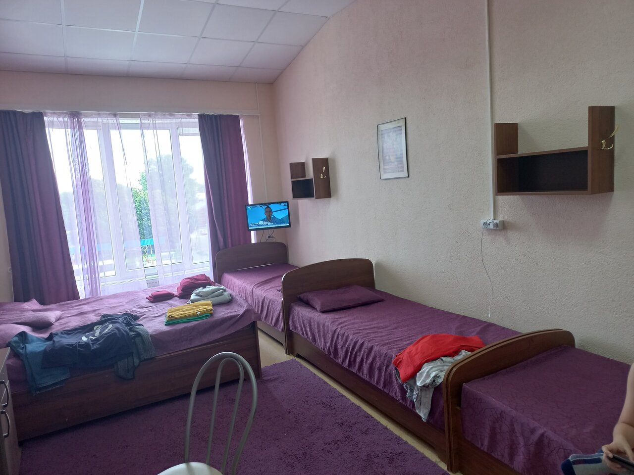 У нас был пятиместный номер. Чисто. Три односпальных кровати и одна двуспальная. А номере телевизор, холодильник, чайник, посуда, вентилятор. Два стола, стулья. Много розеток! Санузел. На этаже кухня, где можно приготовить, разогреть. Очень приветливый персонал. Единственный минус -плохая звукоизоляция)