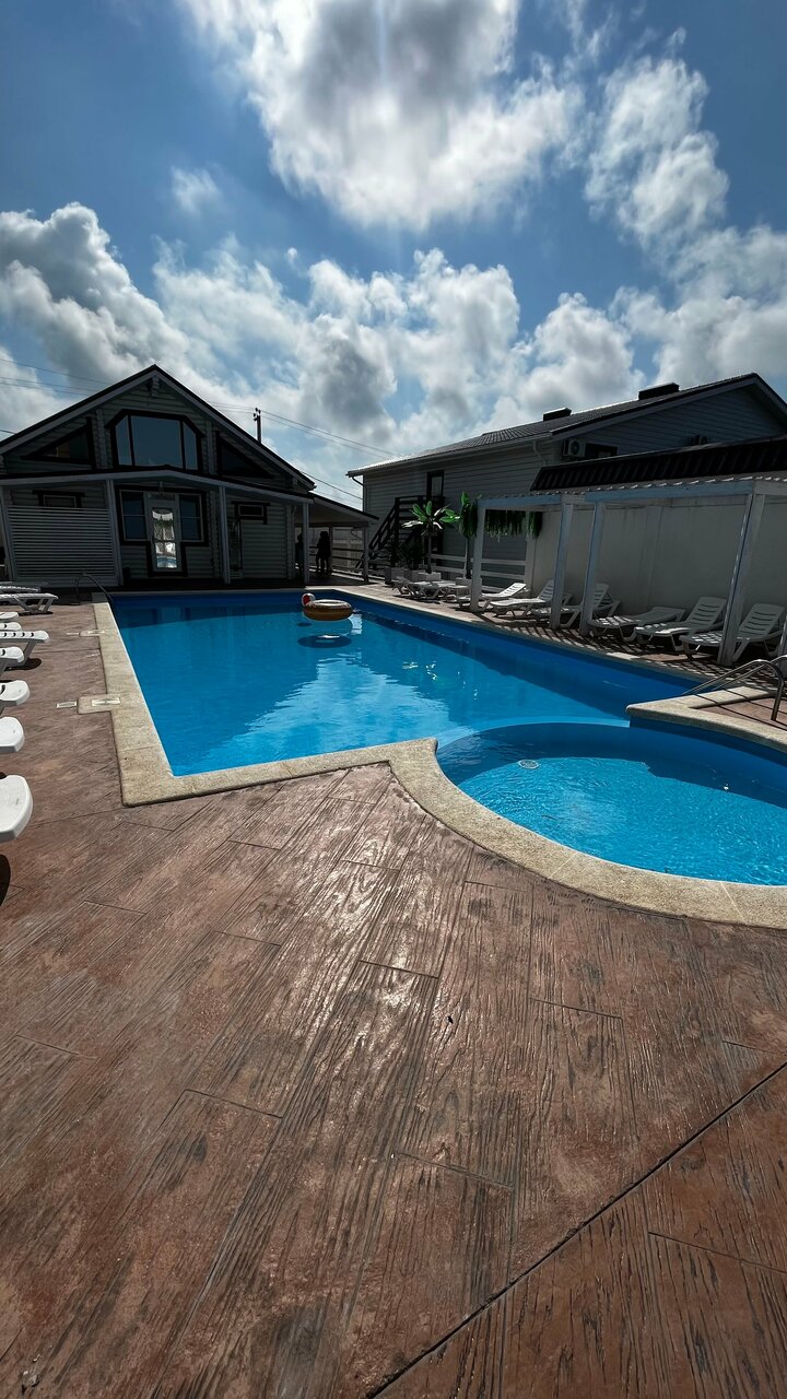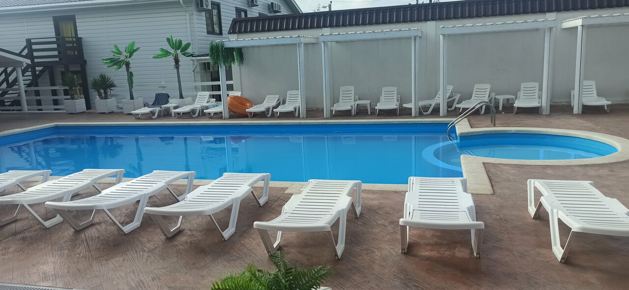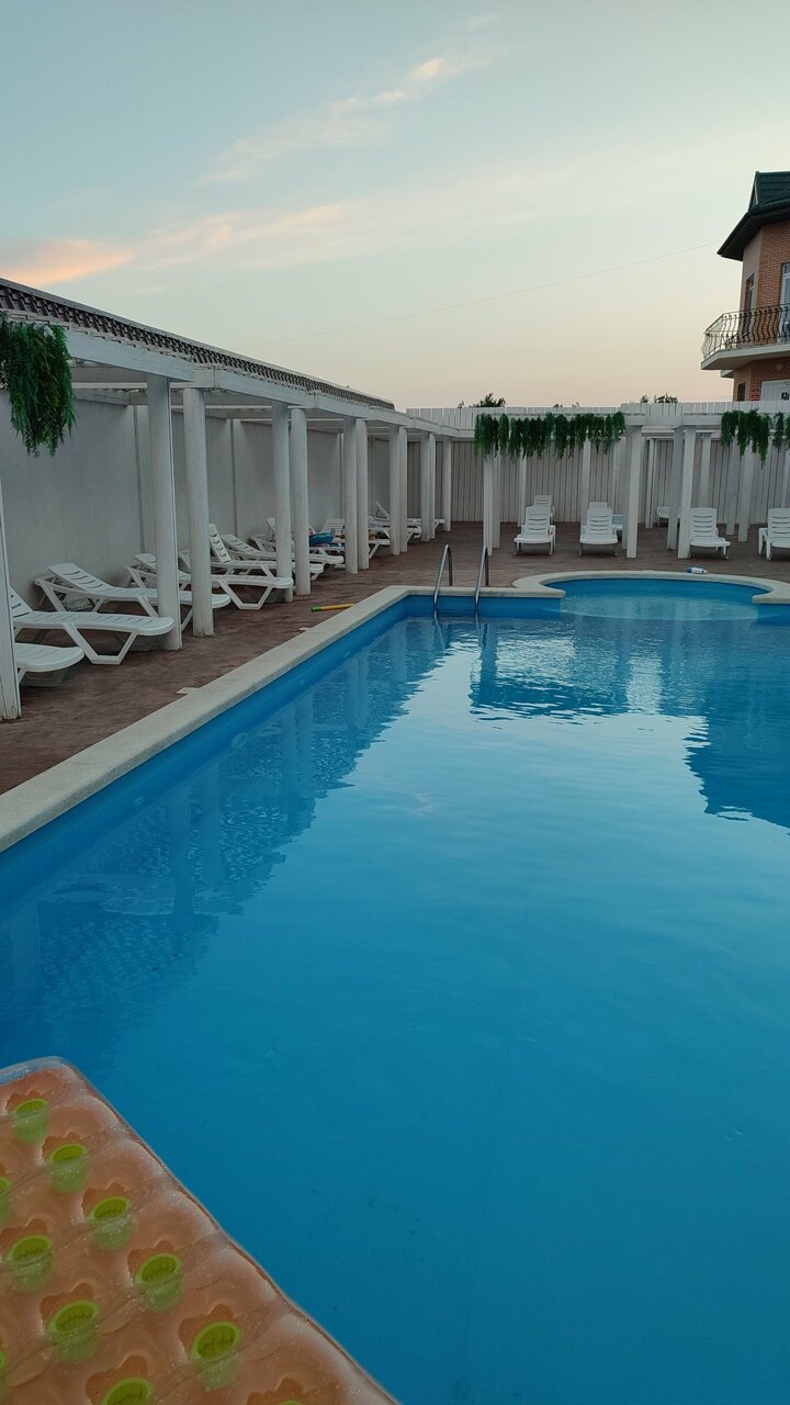 Очень хороший частный отель, понравилось всё, чистый бассейн, хорошие номера с видом на бассейн, в номере есть кондиционер, телевизор, холодильник, фен, душ, туалет. В стоимость включено 3-х разовое питание, еда вкусная, порции средние, мы наедались, каждый день, что-то новое. Единственный минус далеко от моря, но если вы на машине, то 10 мин и вы на городском пляже. Можно вызвать такси до пляжа, примерно 250р по стоимости. Пляж оборудован навесами, шезлонгами, есть зонтики в прокат, сапы, бунгала, довольно широкий. Море чистое, не мелкое, как в Анапе, не цветёт.