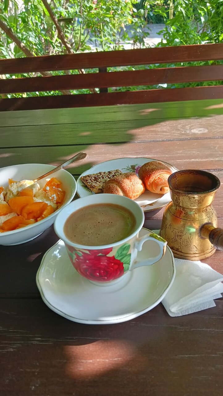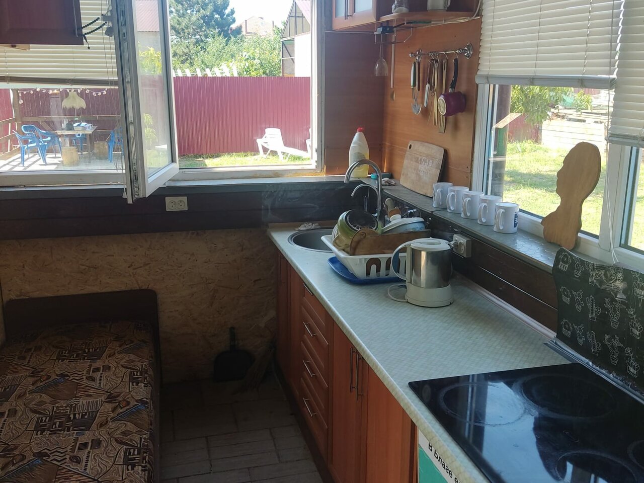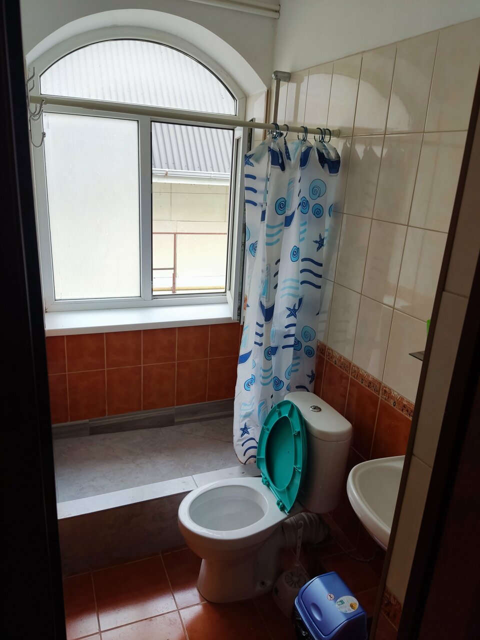 Номер чистый. Туалет и душ в номере. В туалете удобные полочки для туалетных принадлежностей и куча крючков. Есть полотенца, бельё. Две кухни. Одна в помещении, другая летняя. Есть стиральная машина. Можно бесплатно постирать бельё. Большая территория с беседкой и подвесными креслами. Есть где отдохнуть. До моря близко. 15 минут пешком. Пляж обустроенный, море чистое. Рядом полно столовых и магазинов