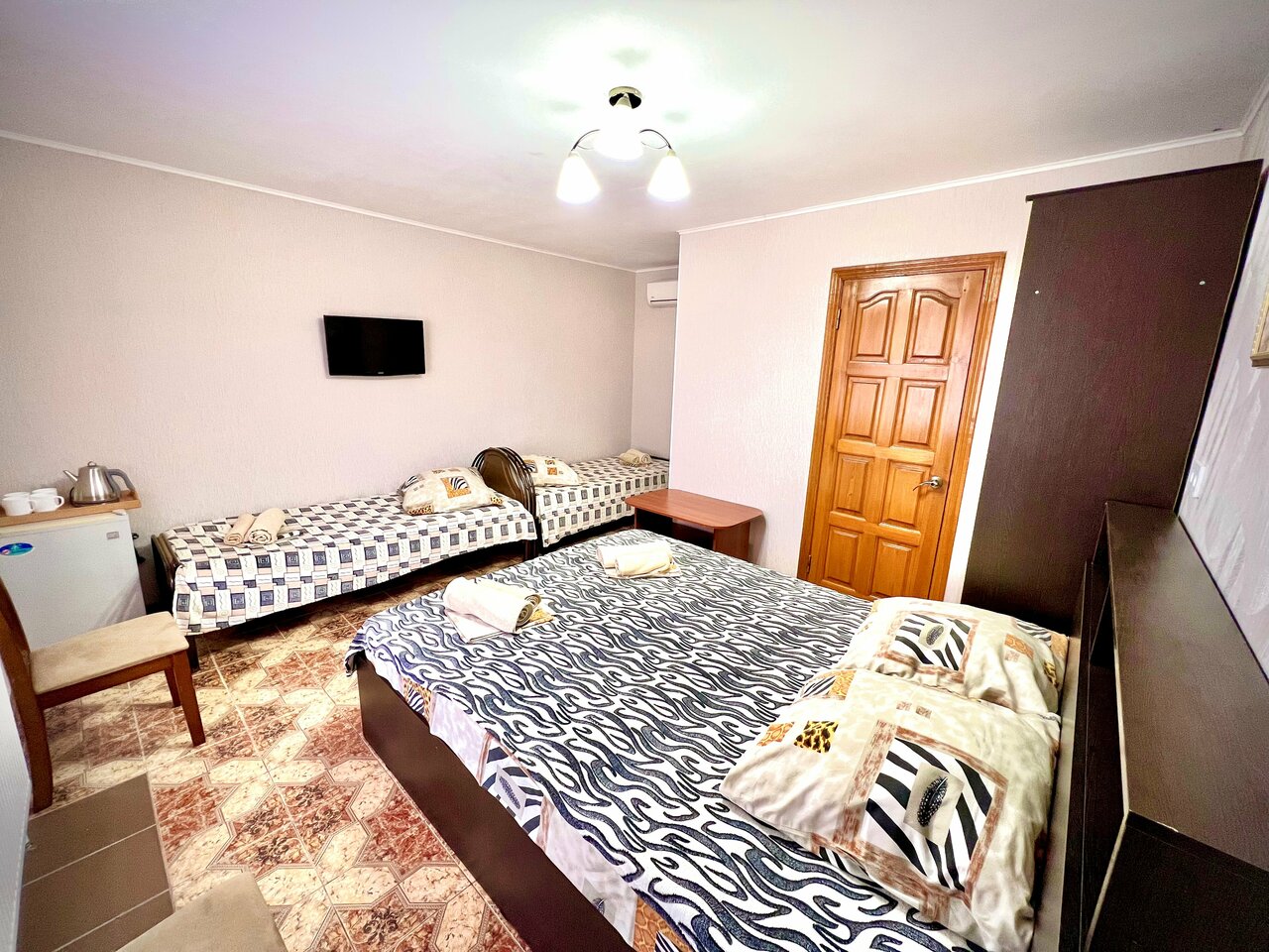 Номер очень маленький, для троих есть спальные места, но одна кровать стоит под кондиционером, ночью его не включить и переставить в другое место кровать невозможно.