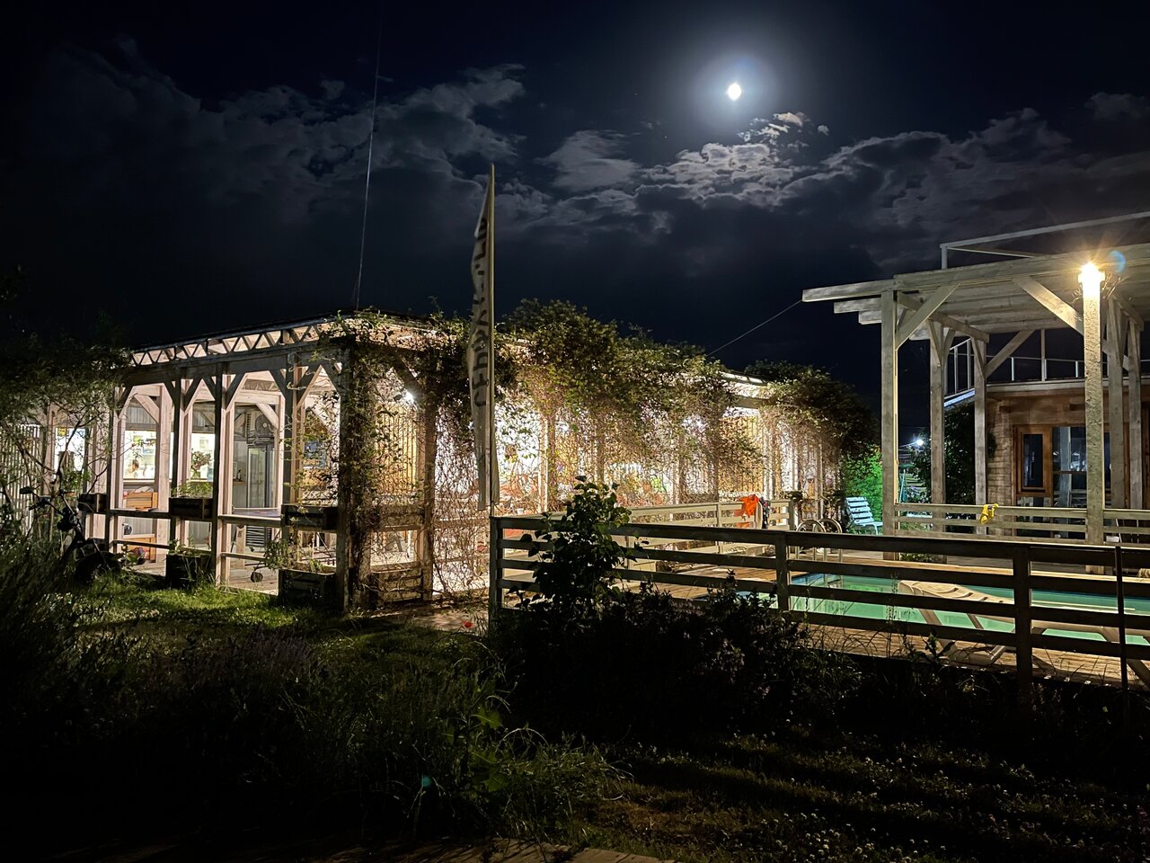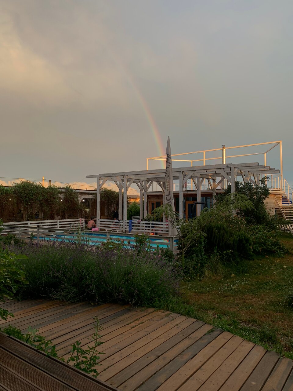 Красиво сделано, лаванда и цветы на территории, бассейн. Своя кайтерская тусовка, есть баня. Кормят вкусно) свой трансфер на косу, Хорошие в общем)