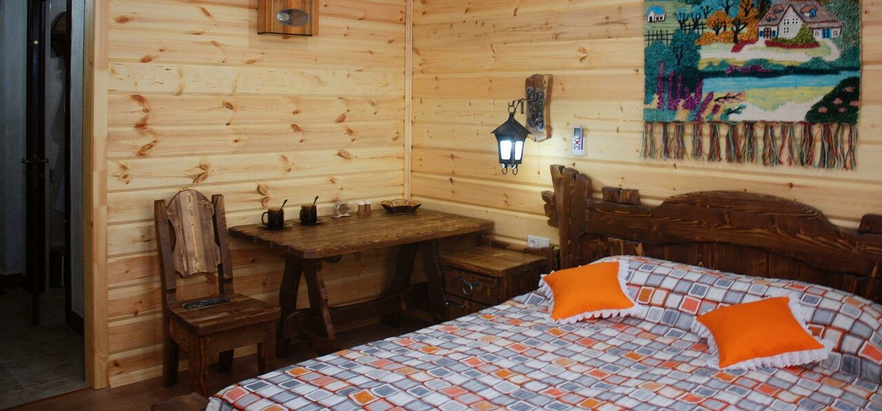 Уютный двухместный номер с двуспальной кроватью. Есть телевизор, кондиционер, комод для одежды, вешалка, прикроватный столик.