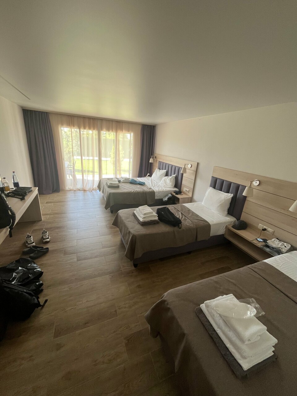 Удобства: — Номера с кондиционером, Wi-Fi, телевизором, холодильником, феном, санузлом. — Два бассейна (открытый и подогреваемый), летняя веранда, бар у бассейна, кафе. — Пляжная зона с шезлонгами, зонтиками, полотенцами (рядом с морем). — Детские услуги: площадка, бассейн, меню, бесплатные кроватки (0–3 года). — Парковка, трансфер (платный), прачечная, уборка.