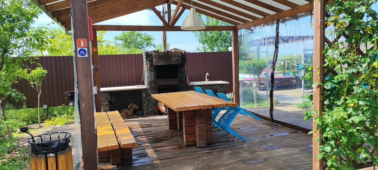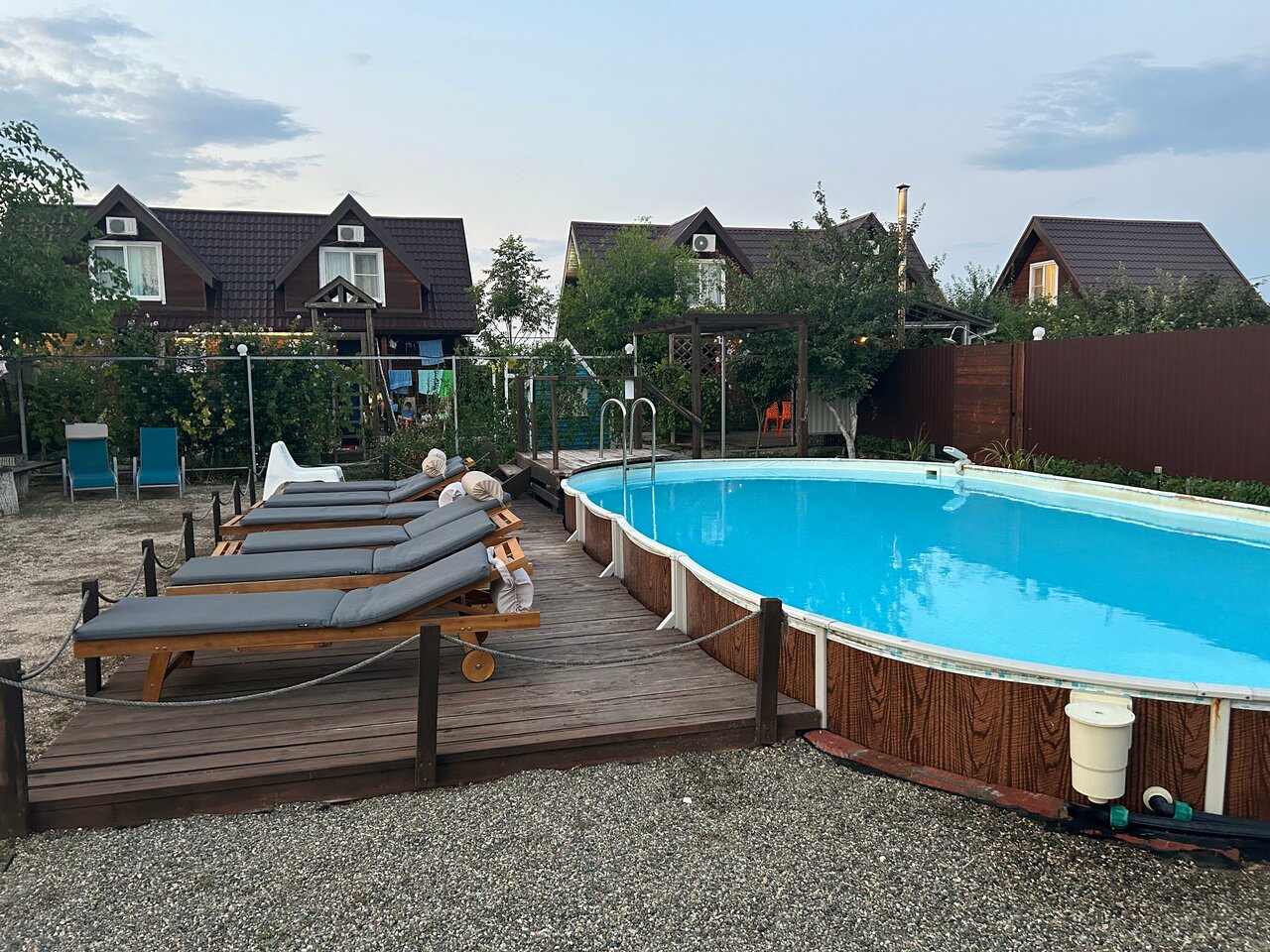 Отдыхали семьей с 22.06 по 4.07.Все очень понравилось.Домики супер,все необходимое для проживания есть.Уборка каждые 3 дня заменой полотенец и постельного белья и даже с мойкой окон.Все чисто,аккуратно.Две мангальные зоны,на одной даже сделаны шторы.Рядом сделана небольная кухня с водой.Поел-сразу все намыл.Не надо тащить грязную посуду в номер и разводить грязь там.Бассейн супер,дети довольны,как слоны.Хозяин клиентоориентированный человек,максимально хочет упростить вам отдых настолько,что организована поставка 20-ти литровых баклах с водой и помпой за символическую цену.Не надо никуда ездить воду искать,все под носом.Две стиральные машинки,зона для глажки.Есть главный вход с заездом для авто,есть на заднем дворе калитка с кодовым замком для выхода в сторону моря-удобно,не надо делать крюк.Бесплатная анимация для детей.Ну а целый детский лагерь во дворе думаю в похвале не нуждается-дети носятся,родители чилят В общем рекомендуем!Всем добра и хорошего отдыха.