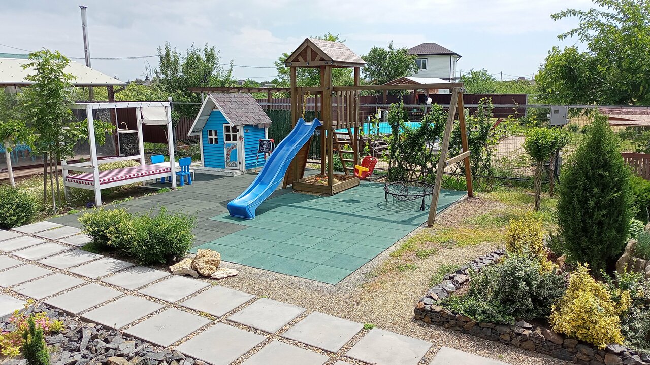 Отдыхали семьёй 5 человек и 2 детей. Все прекрасно разместились в двухэтажном домике. Для детей на территории есть всё, что нужно- батуты площадка и бассейн(не глубокий!). Бассейн не маленький, чистят каждый день. Территория закрытая, детей хорошо видно из домика, все под контролем. Если были какие-то недочёты в домике, сразу устранялись по первой же просьбе. Единственный минус- до моря по прямой может быть и 800м, но по факту идти дольше- мин 15.