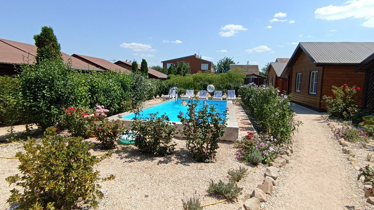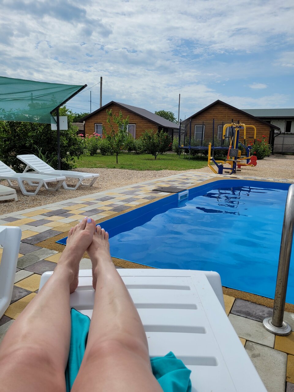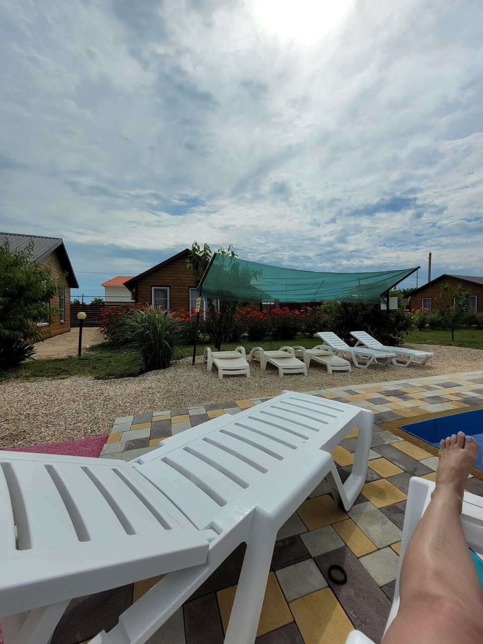 Отличный семейный отдых! Отличная обстановка! Спасибо Сергею и Оксане за радушный прием! На территории много зелени и цветов. Великолепный бассейн, детская площадка и мультфильмы по вечерам покорили детей В домике всё продумано: кондиционер, холодильник, микроволновка, телевизор, wi-fi. При каждом домике своя беседка и кухня со всем необходимым. На территории есть мангальная зона. До моря 10 минут пешком. Приедем ещё раз обязательно