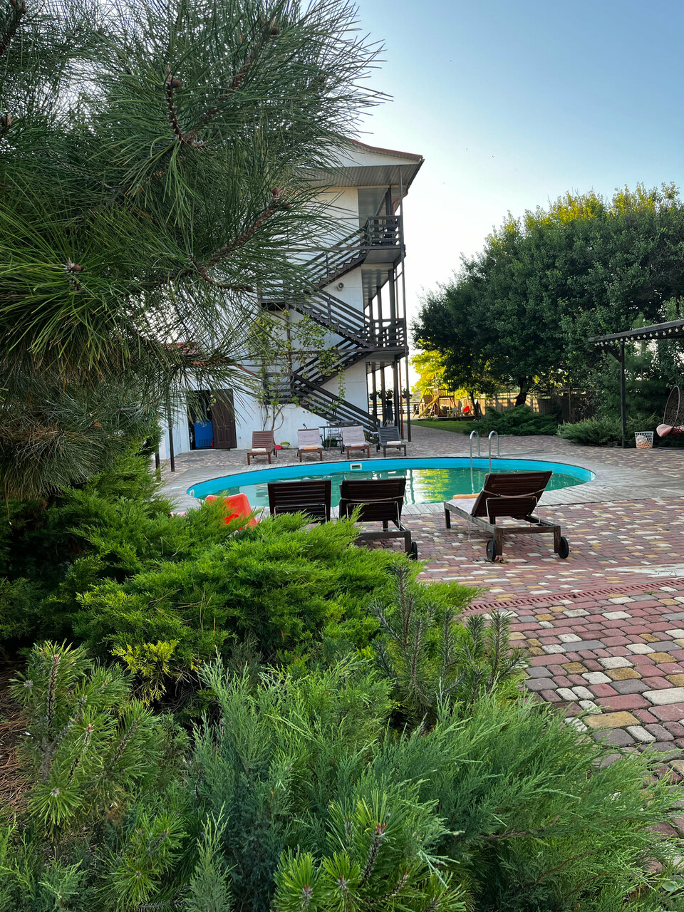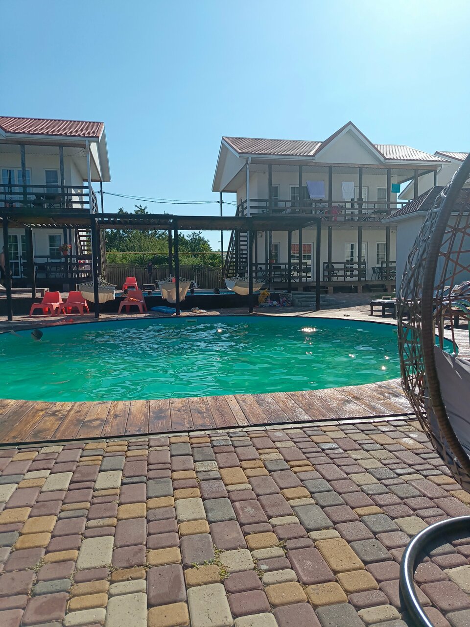 Красивая ухоженная территория. Вежливый и дружелюбный персонал. Чистый комфортный номер. Много мест для отдыха, большая веранда с прекрасным видом. 2 детские площадки, батут. Есть общая кухня, а так же кухня в номере. ( был 4-х местный номер) теплый бассейн. Гамаки, деревянные лежаки, полотенца для бассейна, плетеные подвесные кресла. Море в шаговой доступности. Столовая на территории, еда съедобная не более. Возможно было бы больше внимания уделять чистоте в общих зонах, обновлять детские игрушки, принадлежности для купания. Плюсы-есть детские горшки, накладки на унитаз, скамейки-полставки для ног детские.