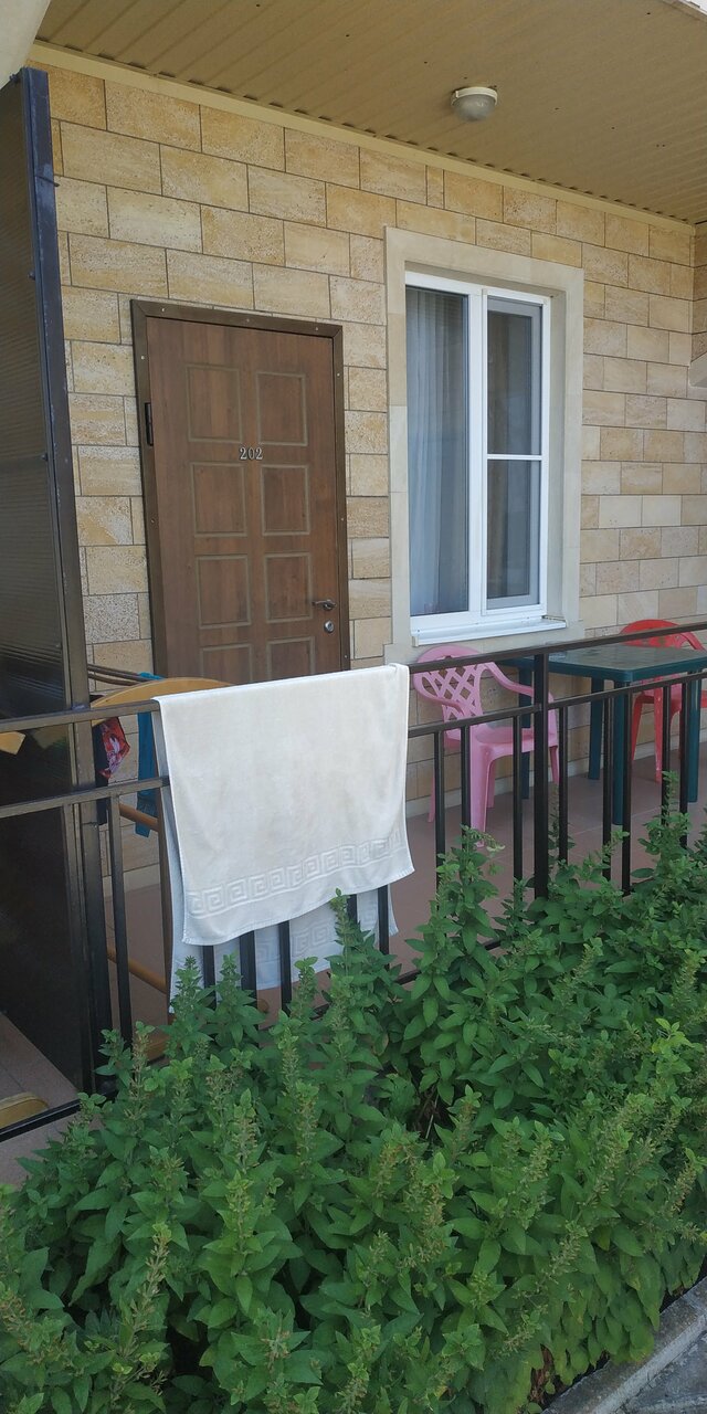 Хороший гостевой дом!В номере есть все удобства. Уборка номера производится каждые 3-4 дня(влажная уборка, смена постельного белья и полотенец). Так же есть в доме прачечная и кухня. Но кухней мы не пользовались, а ходили в столовую которая находится на территории гостевого дома. Девушки готовят вкусно и ценник приятный. Так на территории есть детский и взрослый бассейны, детская площадка и возле каждого номера есть столики для приятных вечерних посиделок. На территории всегда чисто, персонал приятный. Хозяин гостиницы человек с большой буквы. До моря идти 7 минут. Подъем в горку не большой,дорожка до моря асфальтированная. Рекомендую !