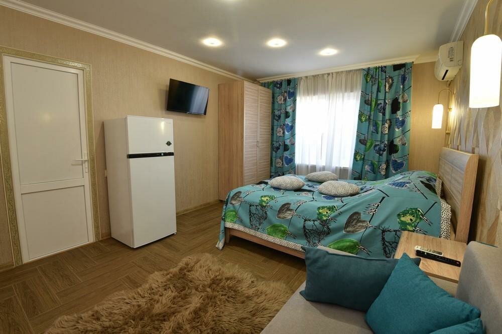 - Современный ремонт в номерах, качественная мебель и техника (кондиционер, холодильник, фен).; Наличие Wi-Fi.; Вежливые, гостеприимные и внимательные хозяева.; Адекватные цены.; Хорошо оборудованные кухни (посуда, техника).