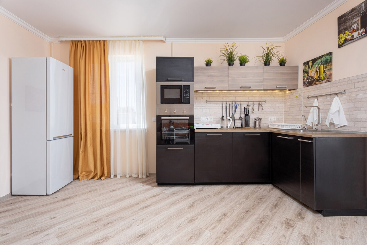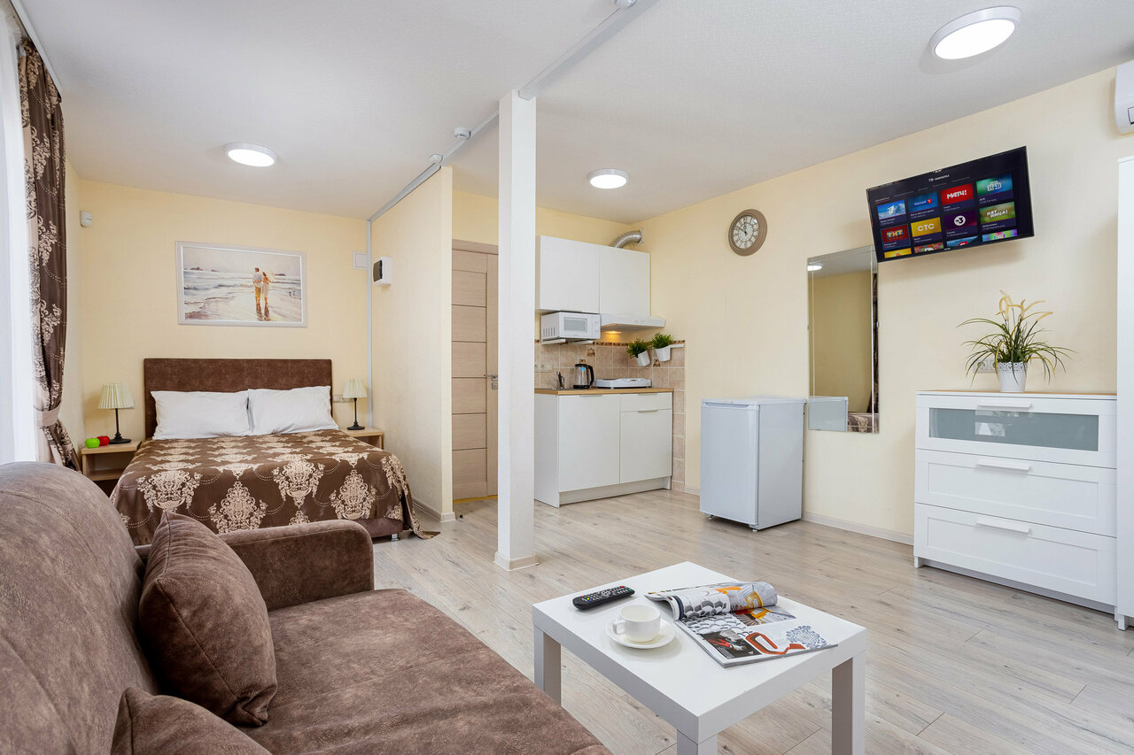 - Наличие кухонного уголка с плитой, микроволновкой и посудой.