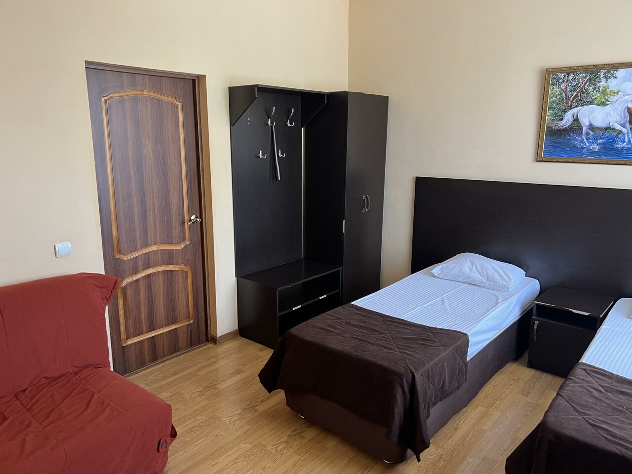 Просторный двухкомнатный семейный номер с балконом, общей площадью 35 м², Предназначен для размещения до 4-х человек. Оборудован большой двуспальной и двумя односпальными кроватями, сплит-системой, ЖК-телевизором, холодильником, шкаф.