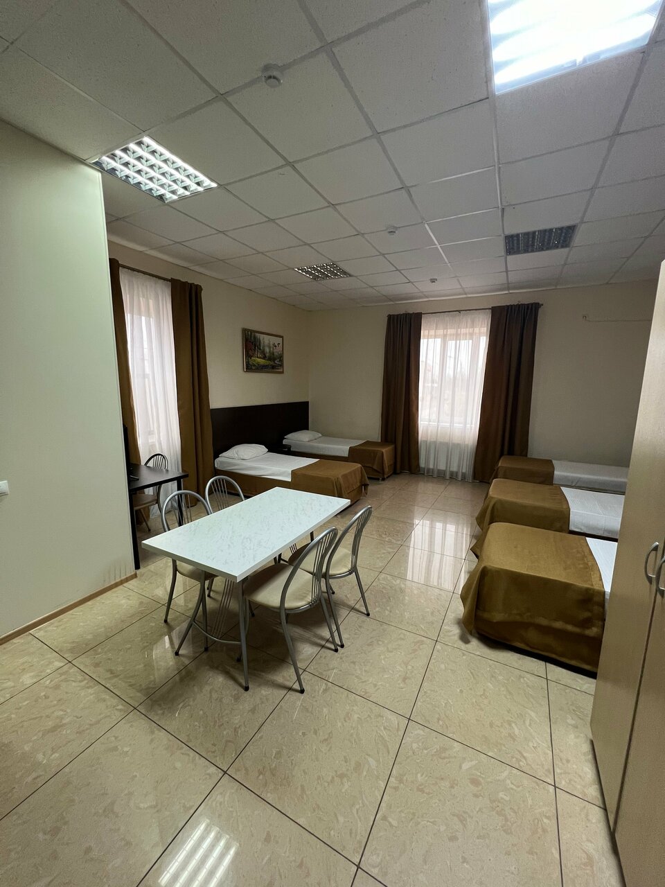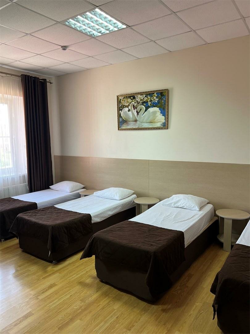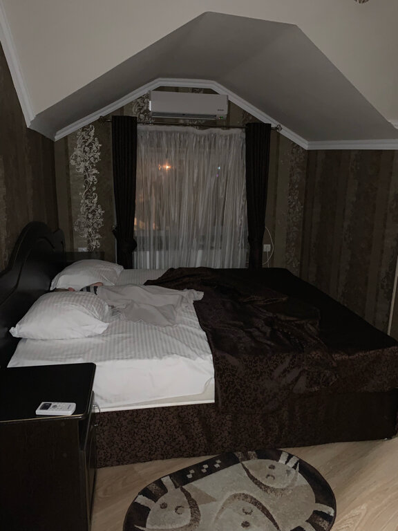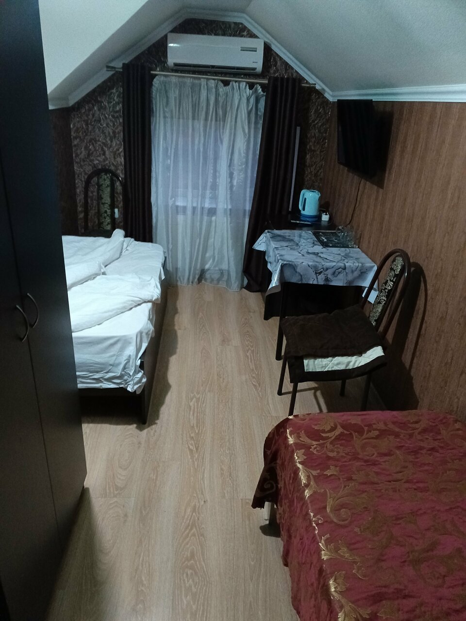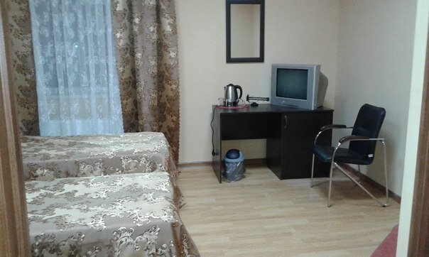 Самая обычная гостиница, расположена практически в самом центре. В шаговой доступности АЗС, шиномонтаж, супермаркет Пятёрочка, на соседней улице есть кафе. Останавливались проездом к морю. Удобства минимальные, сразу понятно что всё рассчитано на проезжающих, холодильник очень маленький (практически не морозит — если нужно что-то охладить как у нас контейнер для сумки -холодильника то вряд-ли получится), душевая очень грязная, кран в душе плохо работает ещё и весь облезлый. Комнаты очень маленькие и очень темные т.к. окно очень маленькое. Номер был на 3-м этаже и потолок был со скосом. Между стенами и кроватью прохода практически нет.