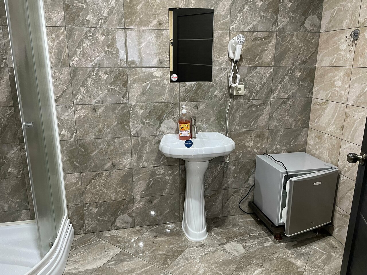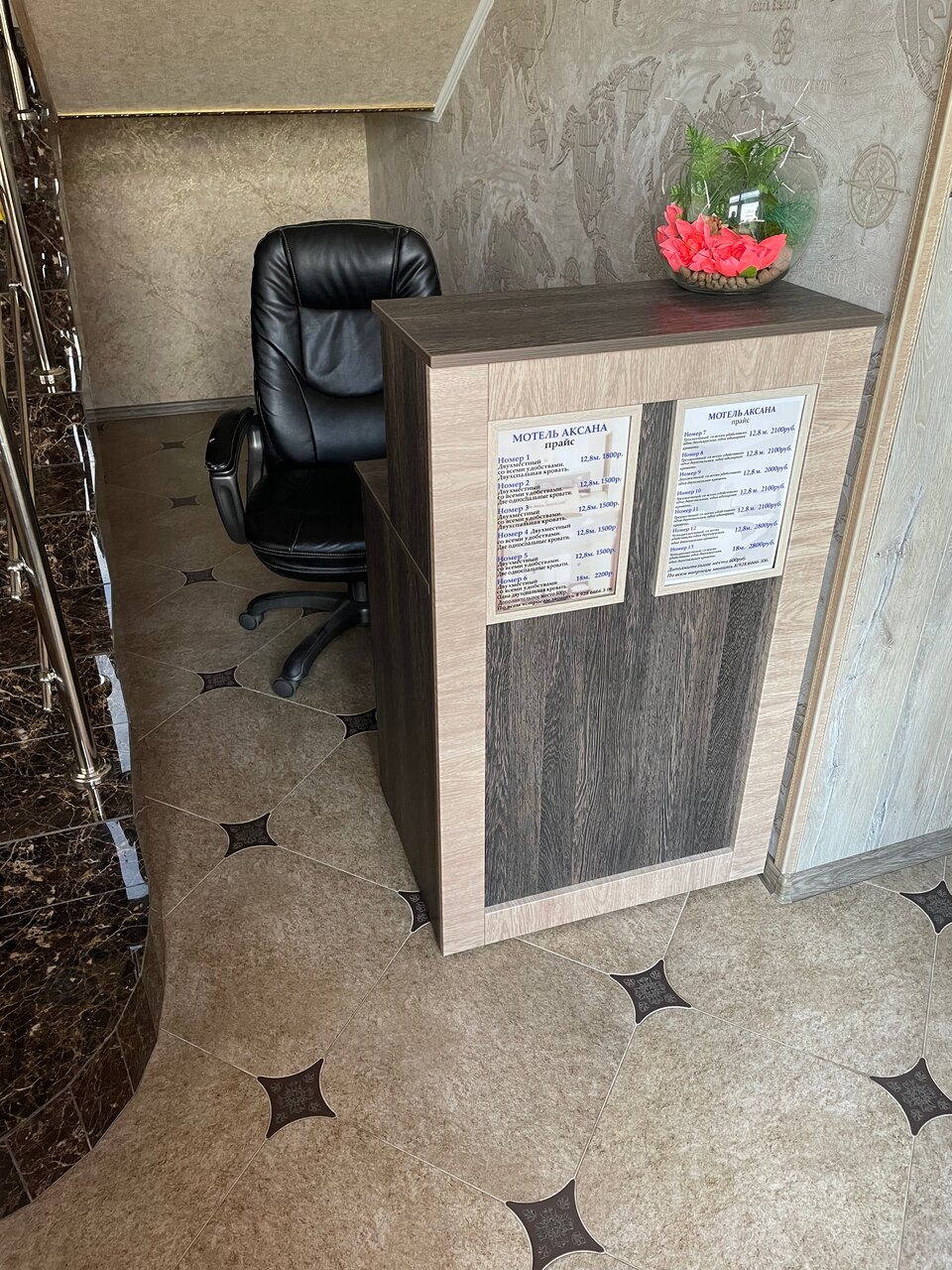 Маленькая уютная гостиница. Чистые номера. Мыло, туалетная бумага, одноразовые тапочки в трёхместном номере 3 пары. Вежливая отзывчивая девушка администратор. Не было холодильника в номере — предоставили. Красивый интерьер (тем более для придорожной гостиницы). Кондиционер в номере. Своя парковка. Заезд по дублеру от заправки Shell — и плюс (не так так слышен шум машин, у нас окна выходили на противоположную сторону от дороги) и минус, т. к. можно проехать мимо. В 100 метрах столовая с прекрасной кухней. В общем за 3000 рублей за сутки такой трёхместный номер — очень приятная пауза в вашем путешествии. Рекомендую.