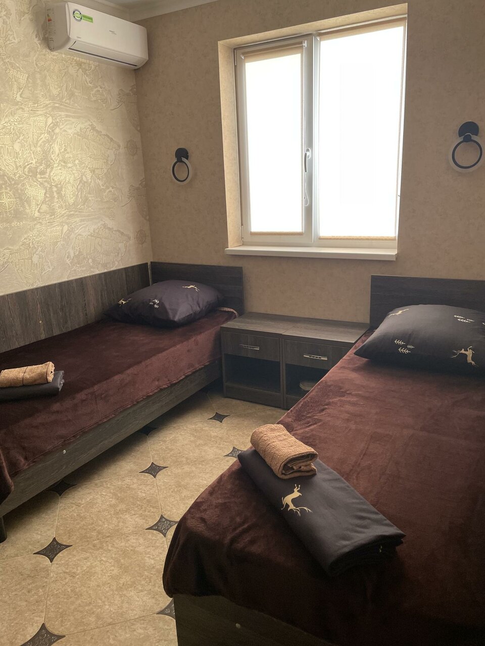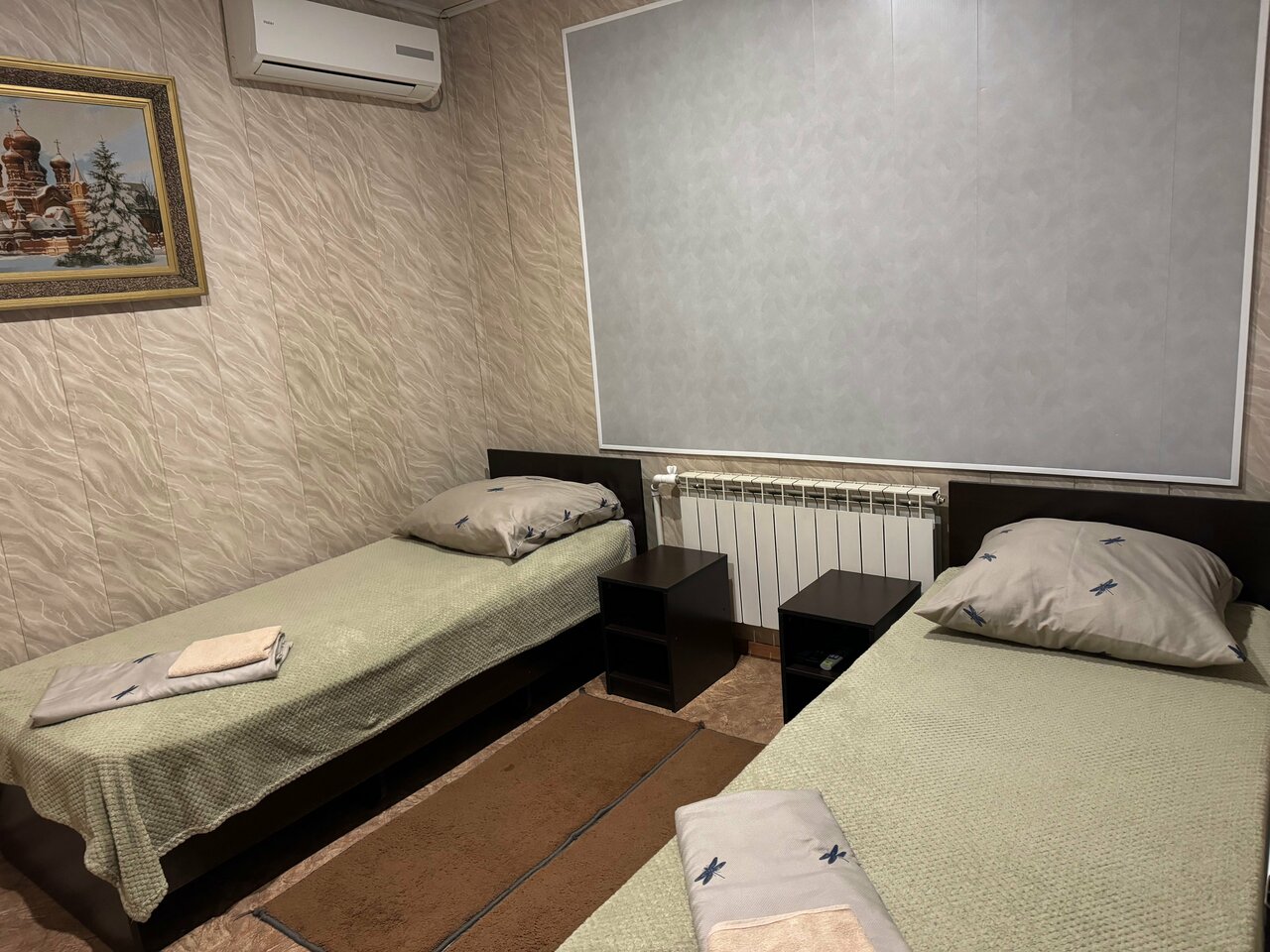 В номере две односпальные кровати туалет раковина душ сплит телевизор , тумбочки , шкаф, тапочки, мыло