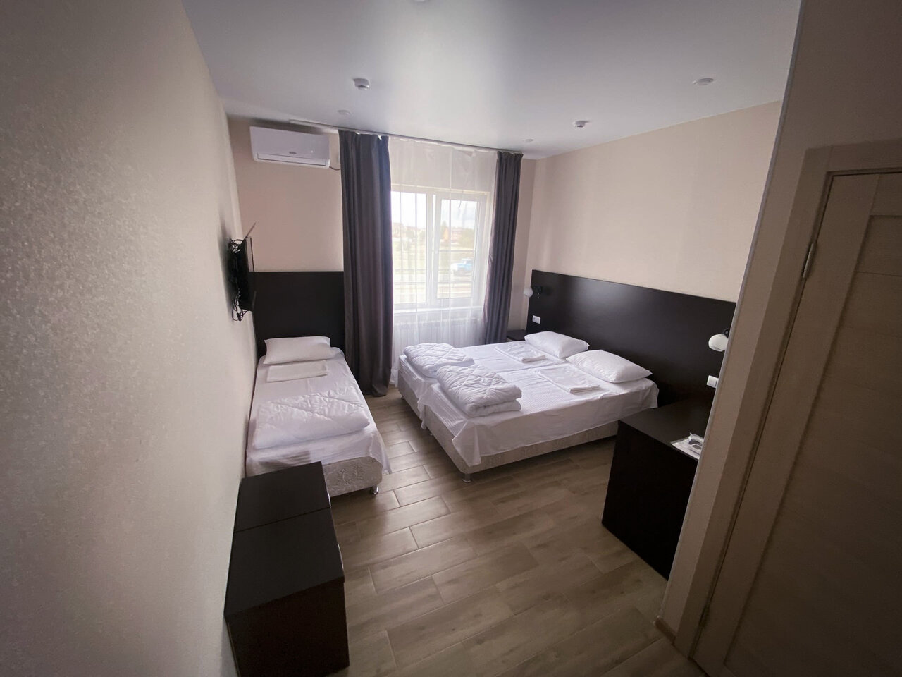 Трёхместный номер с тремя отдельными кроватями В номере есть : кондиционер, телевизор, мини-холодильник, электрический чайник, фен, средства личной гигиены (шампунь, зубные щетки), бесплатный Wi-Fi.Дополнительно в каждый номер можно поставить д...
