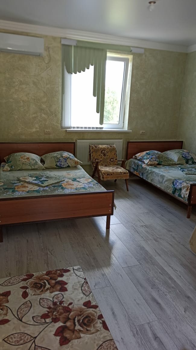 Снимали номер на 4-х по дороге в Сочи за 2000. В комнате 2 2-х спальные кровати и одна односпалка. Чистенько, чистое постельное,в комнате душ,туалет, кондиционер, телевизор. Во дворе беседка, качелька. Есть всё чтобы отдохнуть с дороги. По желанию могут приготовить завтрак.
