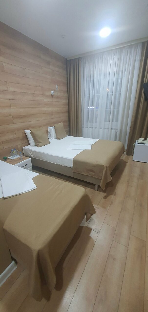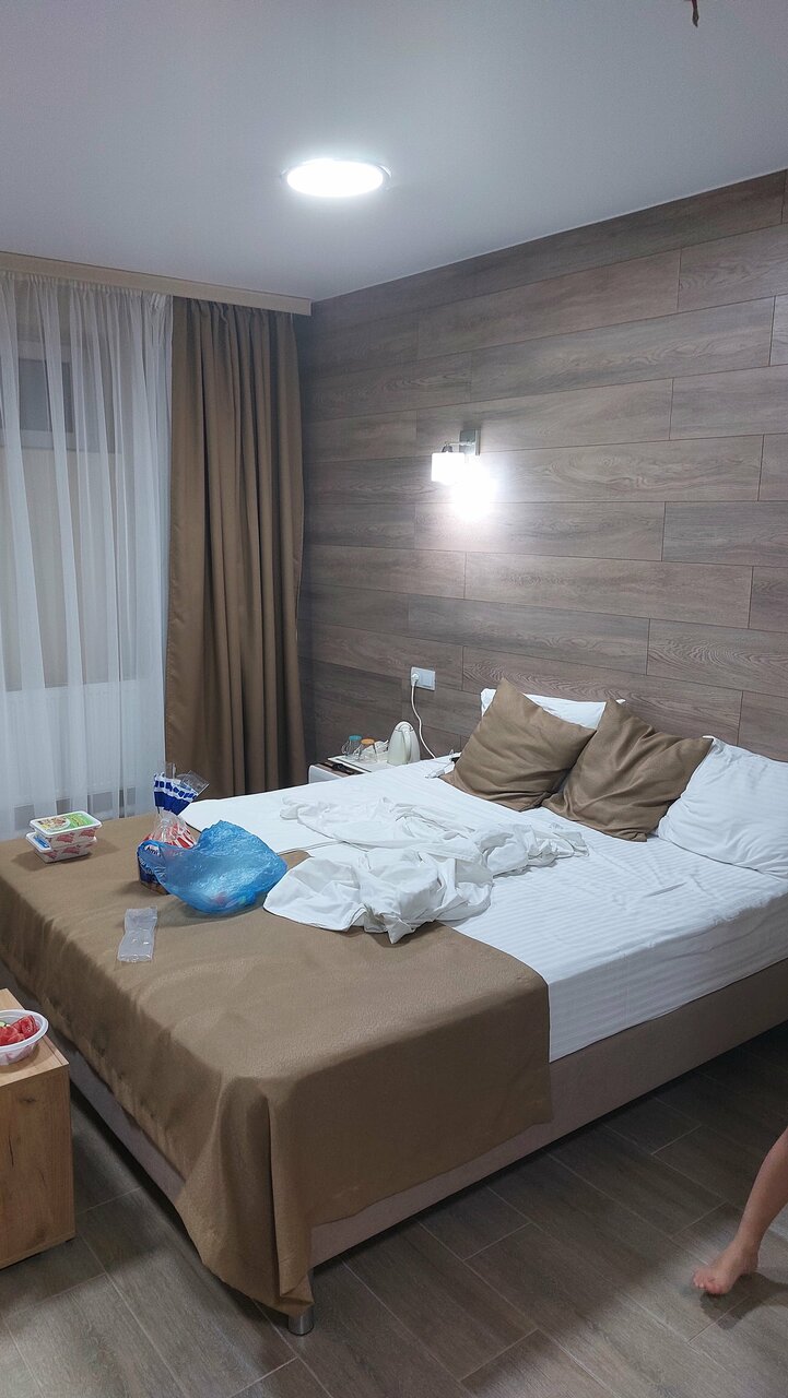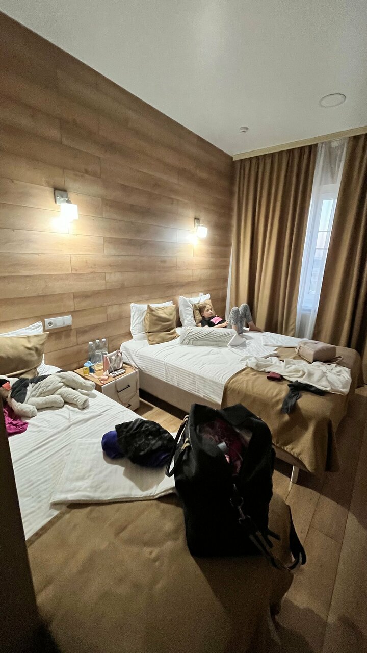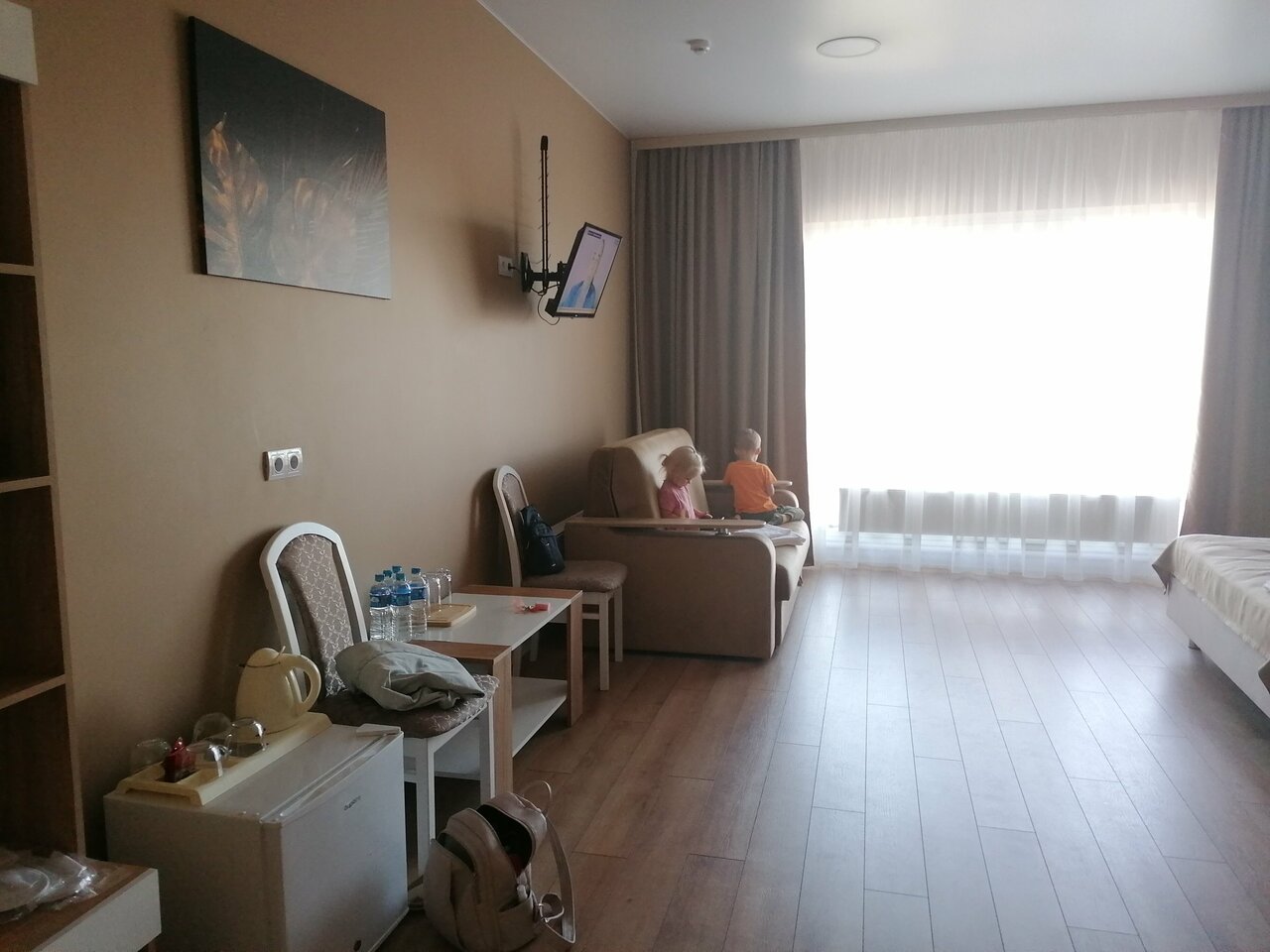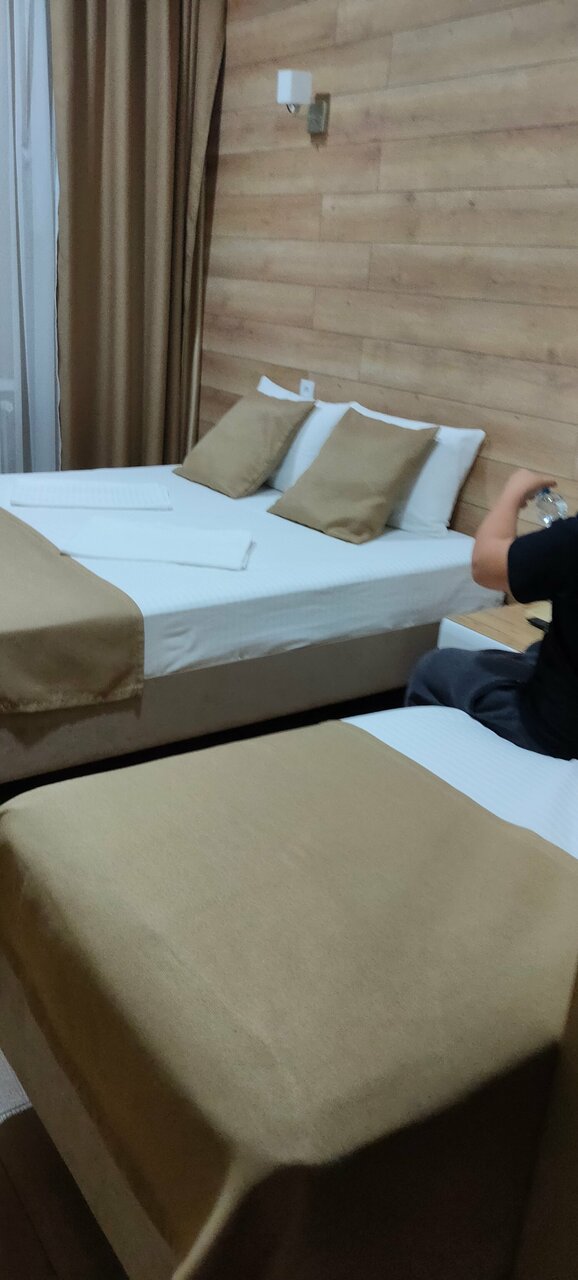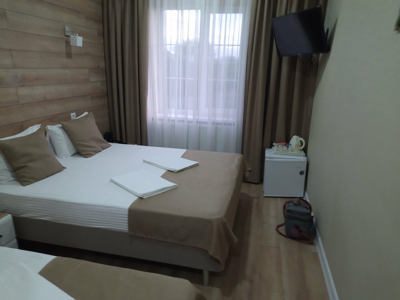 Мы в восторге. Ехали в августе 2022 на море-я,муж и 2 детей 6 и 10 лет. Остановились, зашли в отель (не бронировали номер!).Администратор сказала, что свободных номеров нет, но она постарается нам помочь. В итоге был найден 2-х местный номер, и так как для четверых этот номер не предназначен, предложила старшего ребёнка взять к себе в комнату отдыха. Мы поднялись в номер, там стояла огромная кровать, на которой мы прекрасно все уместились. Номер сам шикарный, чистый. Свежее выглаженное постельное бельё, в душевой полотенца, гели и шампуни, зубные щетки и паста. Всё идеально чисто, отличный новый ремонт, кондиционер, телевизор. Так же в подвале был холодильник, в который нам любезно разрешили положить продукты и охлаждающие элементы из сумки-холодильника.Так же в номере стояли бутылочки с питьевой водой. В общем всё на высшем уровне!