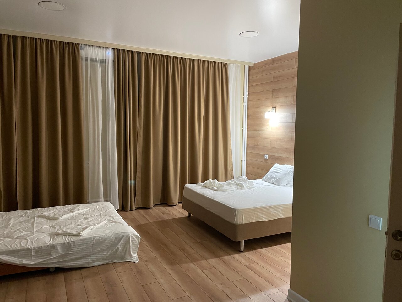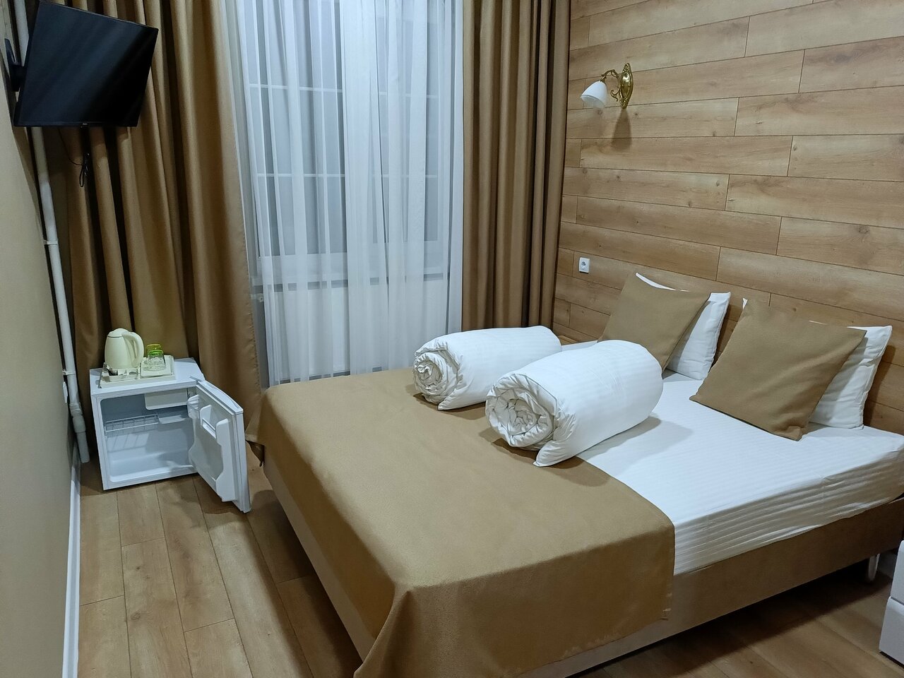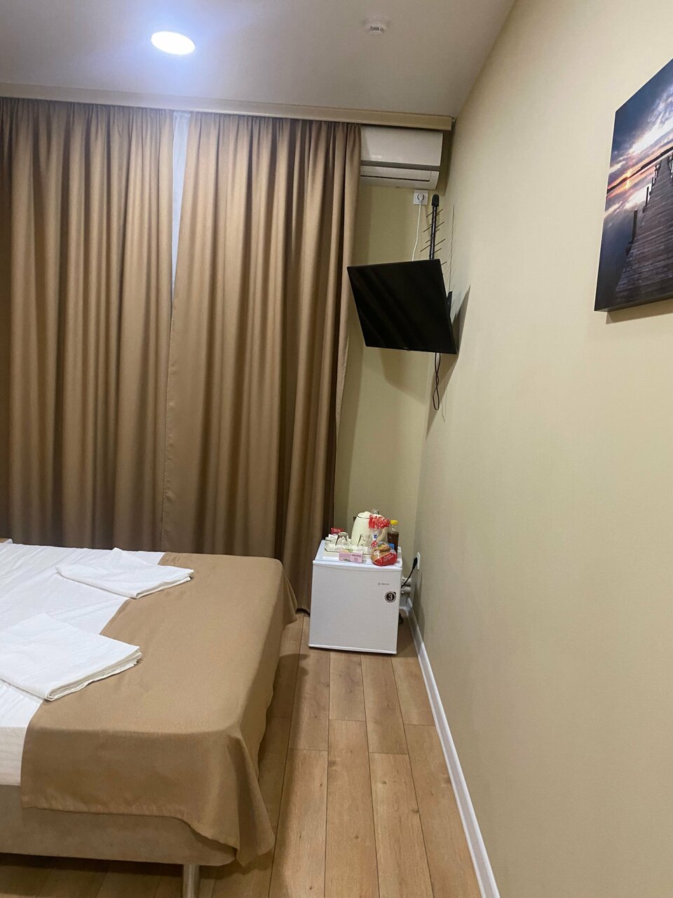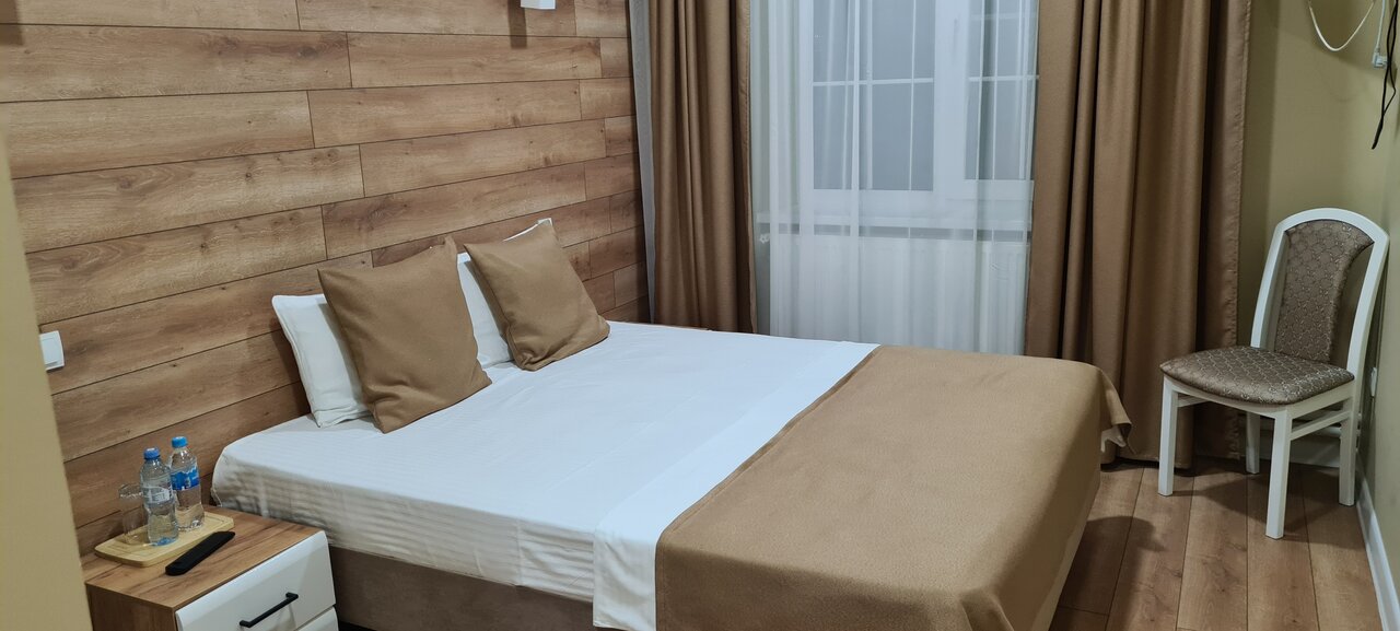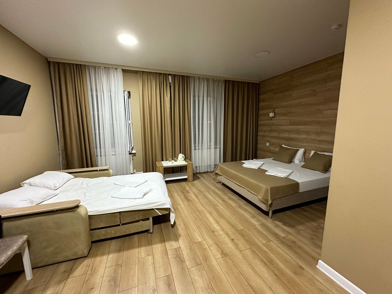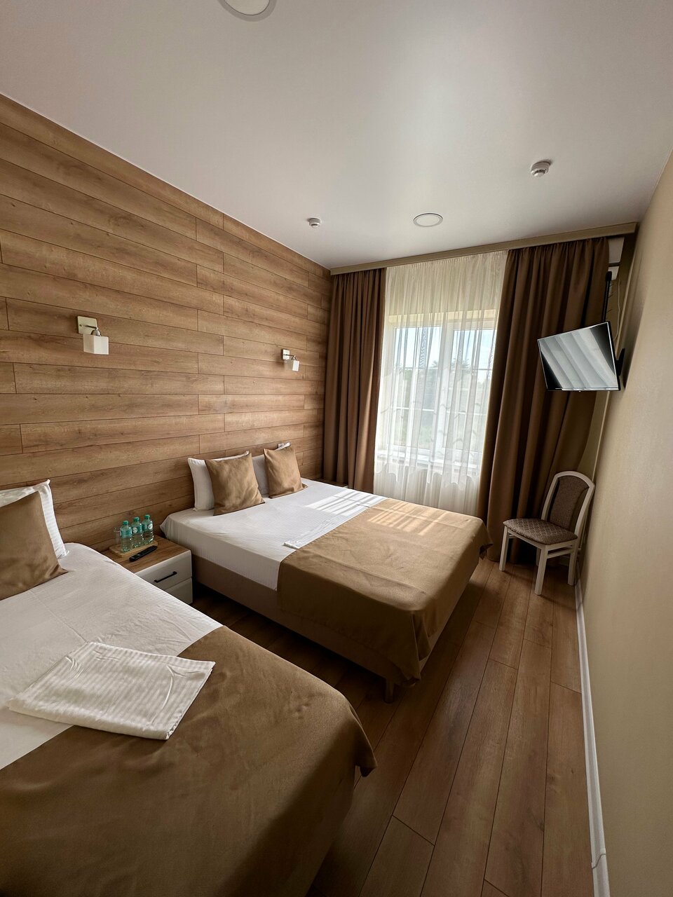 Мы в восторге. Ехали в августе 2022 на море-я,муж и 2 детей 6 и 10 лет. Остановились, зашли в отель (не бронировали номер!).Администратор сказала, что свободных номеров нет, но она постарается нам помочь. В итоге был найден 2-х местный номер, и так как для четверых этот номер не предназначен, предложила старшего ребёнка взять к себе в комнату отдыха. Мы поднялись в номер, там стояла огромная кровать, на которой мы прекрасно все уместились. Номер сам шикарный, чистый. Свежее выглаженное постельное бельё, в душевой полотенца, гели и шампуни, зубные щетки и паста. Всё идеально чисто, отличный новый ремонт, кондиционер, телевизор. Так же в подвале был холодильник, в который нам любезно разрешили положить продукты и охлаждающие элементы из сумки-холодильника.Так же в номере стояли бутылочки с питьевой водой. В общем всё на высшем уровне!