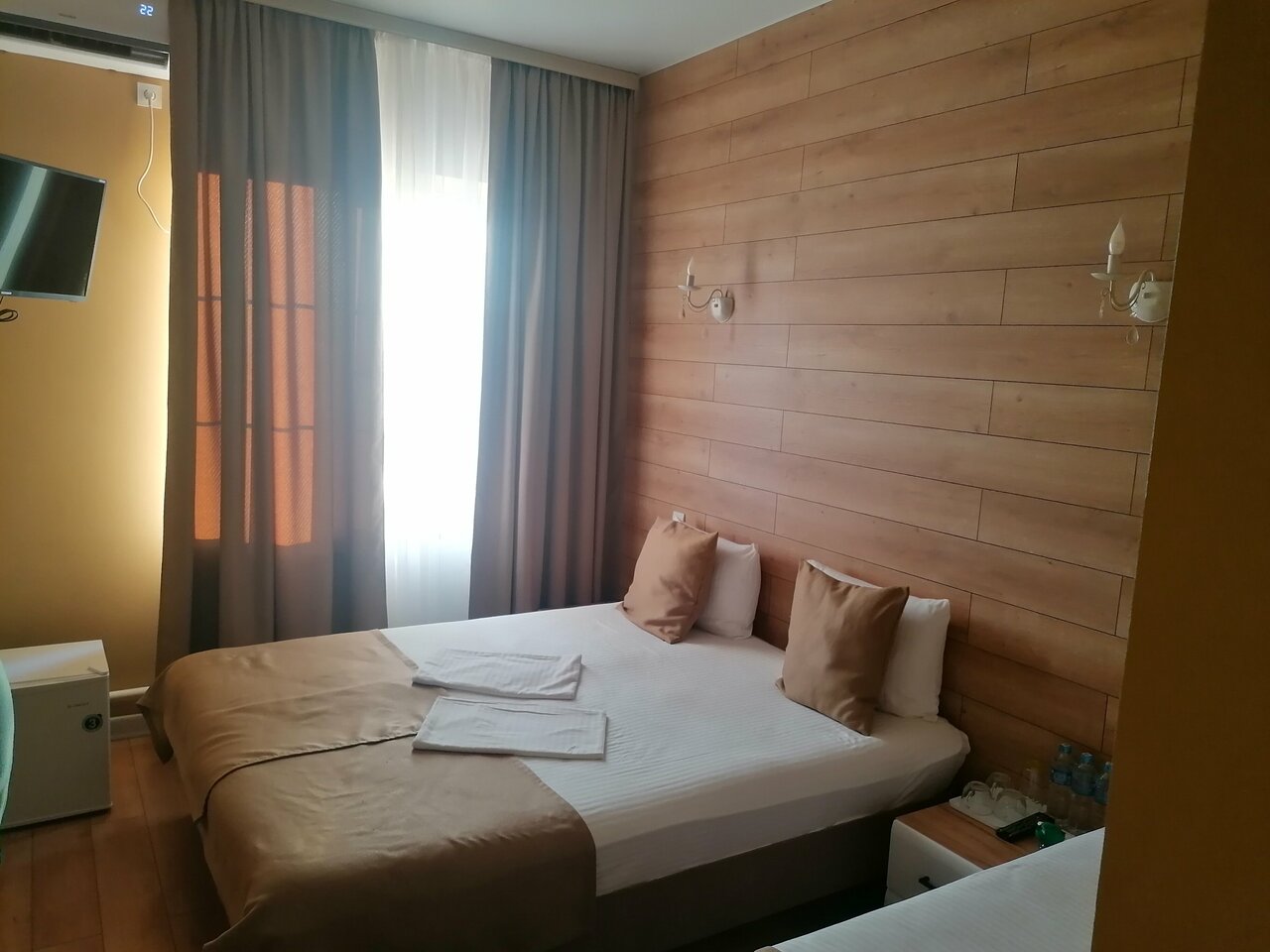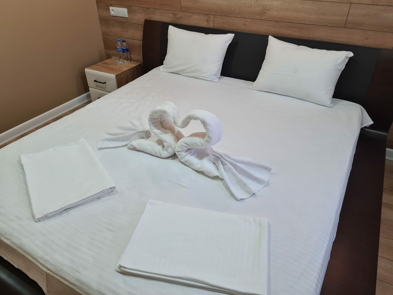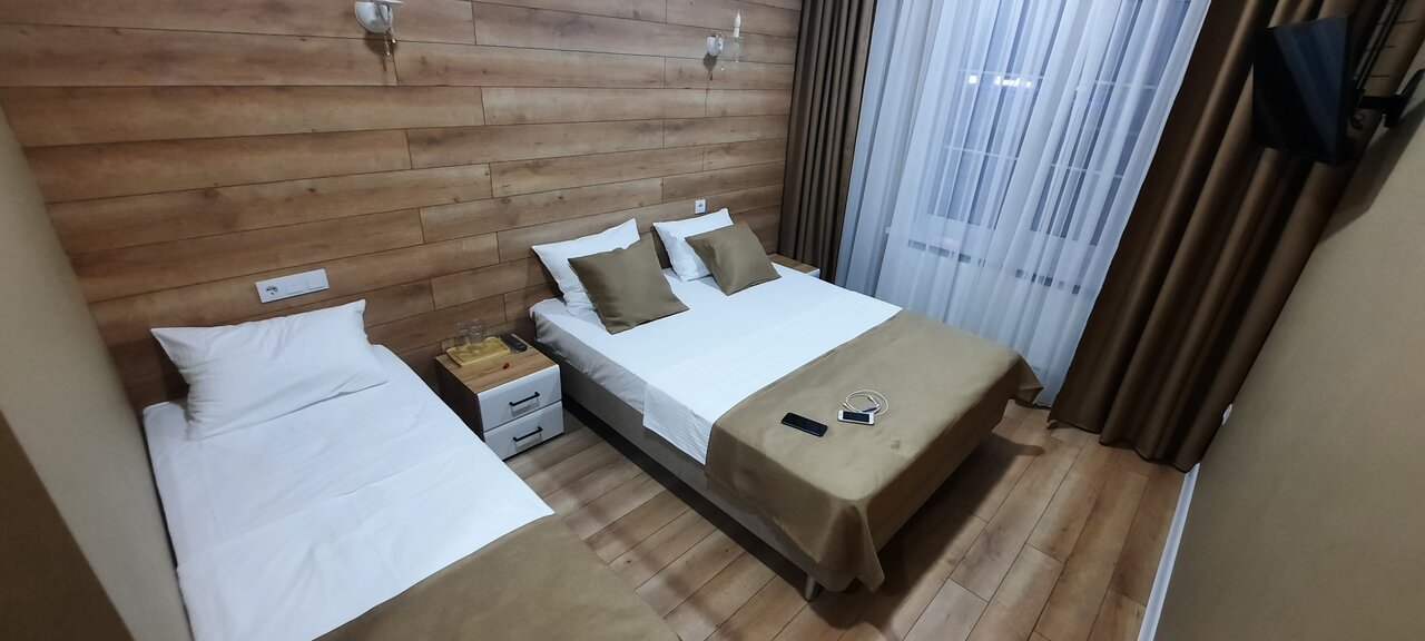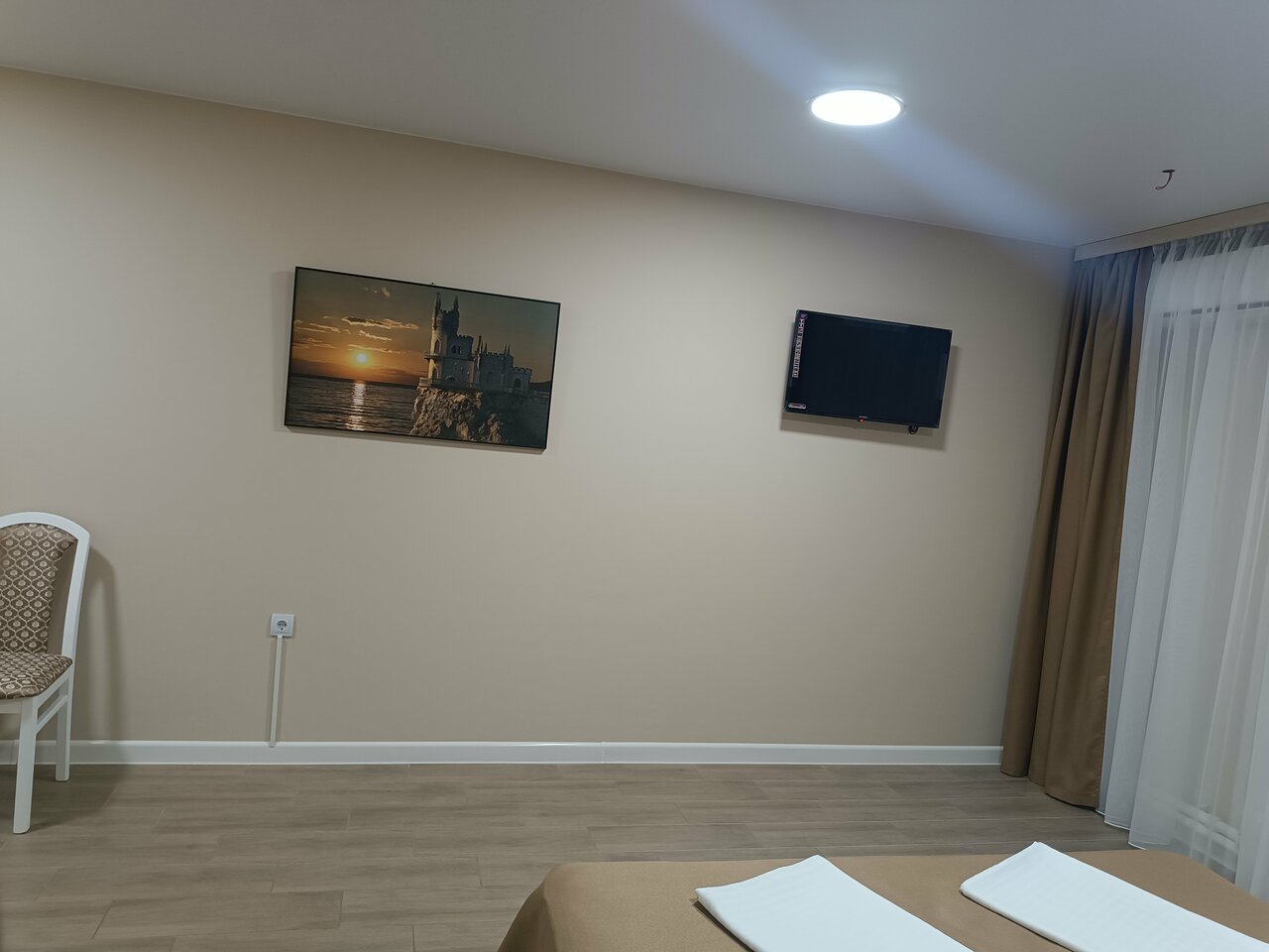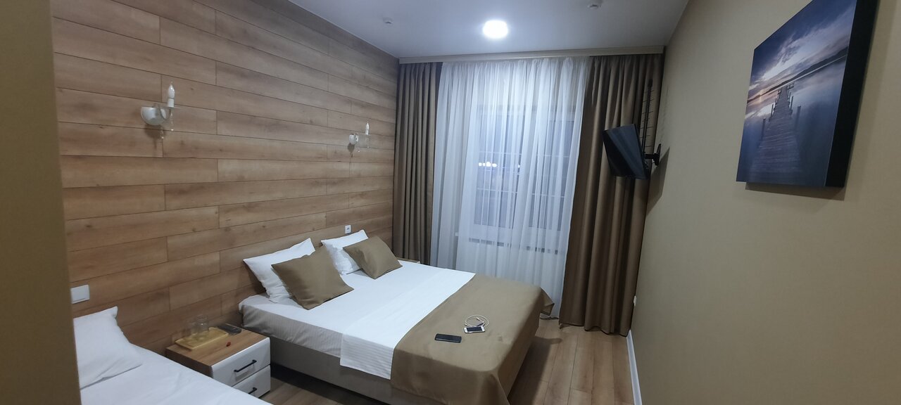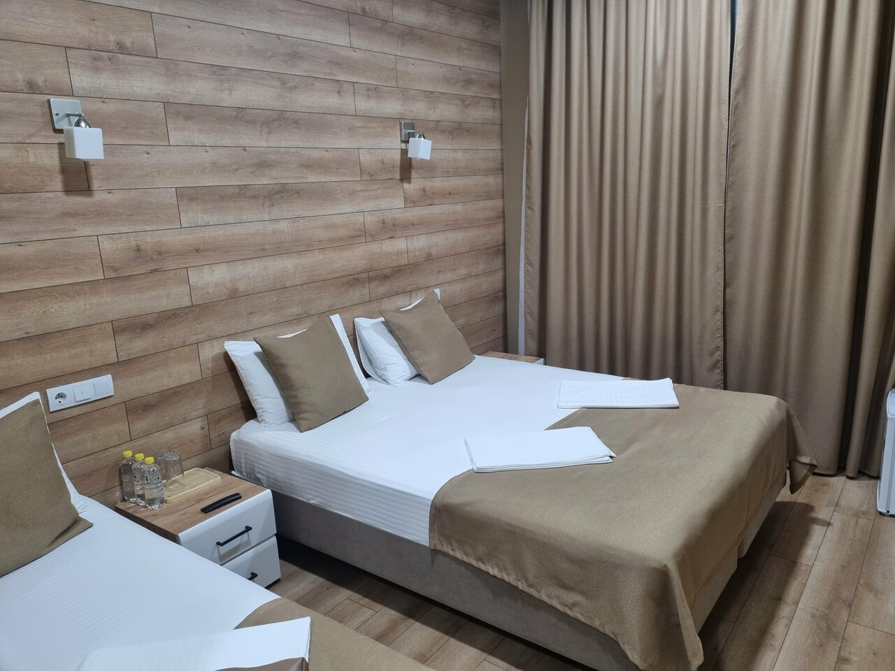 Мы в восторге. Ехали в августе 2022 на море-я,муж и 2 детей 6 и 10 лет. Остановились, зашли в отель (не бронировали номер!).Администратор сказала, что свободных номеров нет, но она постарается нам помочь. В итоге был найден 2-х местный номер, и так как для четверых этот номер не предназначен, предложила старшего ребёнка взять к себе в комнату отдыха. Мы поднялись в номер, там стояла огромная кровать, на которой мы прекрасно все уместились. Номер сам шикарный, чистый. Свежее выглаженное постельное бельё, в душевой полотенца, гели и шампуни, зубные щетки и паста. Всё идеально чисто, отличный новый ремонт, кондиционер, телевизор. Так же в подвале был холодильник, в который нам любезно разрешили положить продукты и охлаждающие элементы из сумки-холодильника.Так же в номере стояли бутылочки с питьевой водой. В общем всё на высшем уровне!