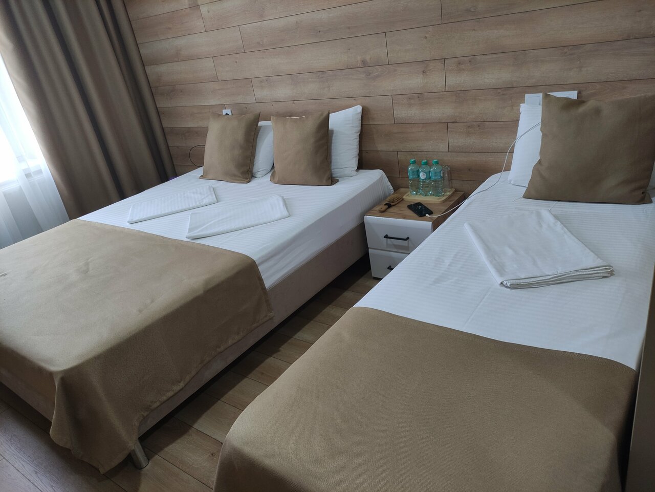 Стандартный номер с двумя кроватями. В номере кондиционер, чайник, телевизор, душевая комната с удобствами, мыльные принадлежности, тапочки, фен.
