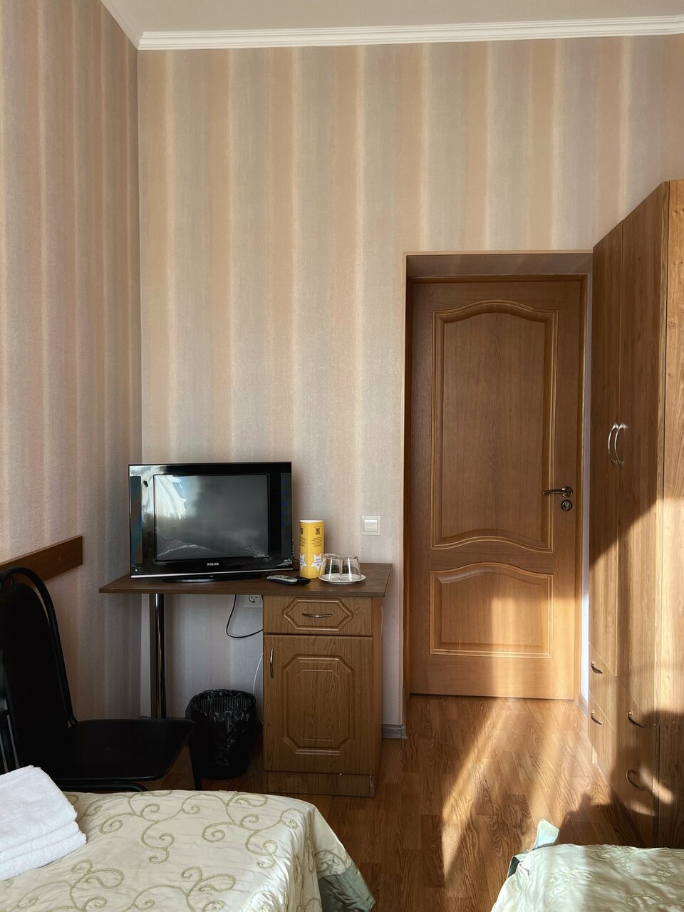 Джуниор Сюит . Улучшенный стандартный номер с двуспальной кроватью и бесплатным дополнительным местом на 3 человека.В номере есть все необходимое для проживания:Набор полотенец и косметикиТапочки (по запросу гостя)ФенХолодильникТелевизорШкаф