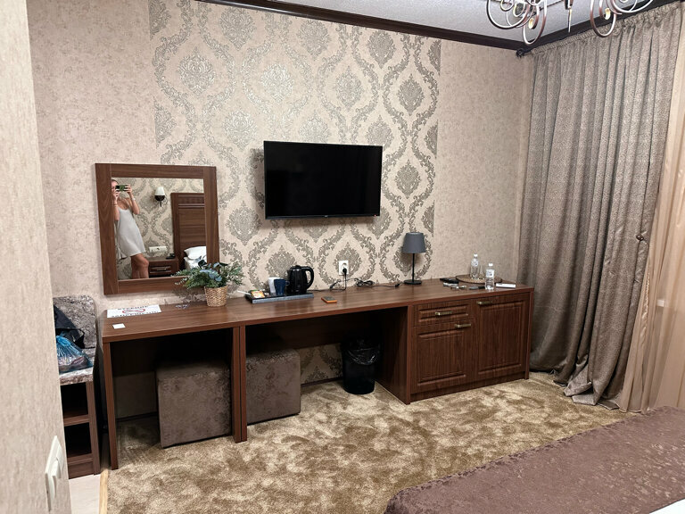 Великолепный и чистейшей отель. В номере 2 халата, большая 2-х спальная кровать, телевизор и конечно же холодильник(по приходу надо включать). Очень порадовала атмосфера в стиле лофт))). Огромный шкаф, тв с различными каналами, парковка. В шаговой доступности магазины. Считаю что отель ничуть не уступает немецкому в Штутгарте 3 звезды, а по многим показателям превосходит, хотя бы своей территорией и озеленением.