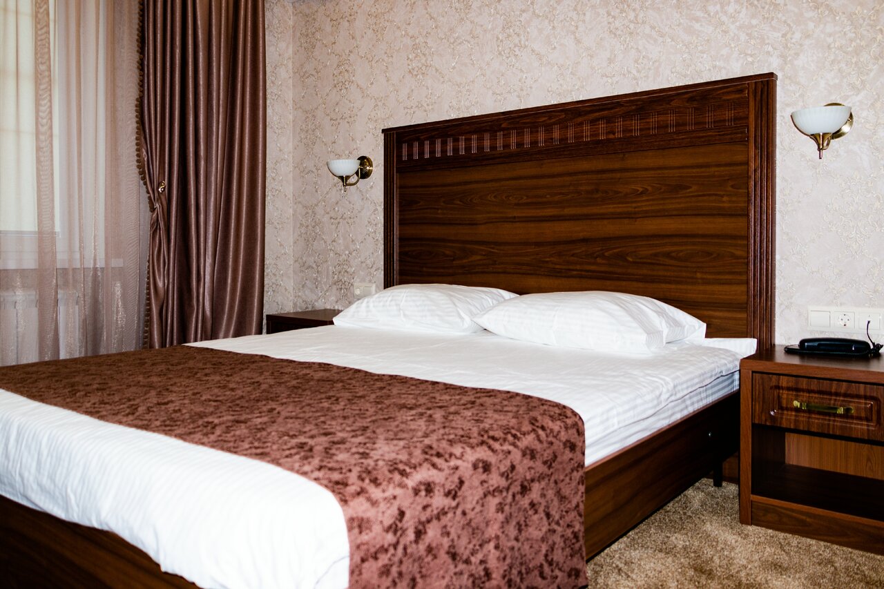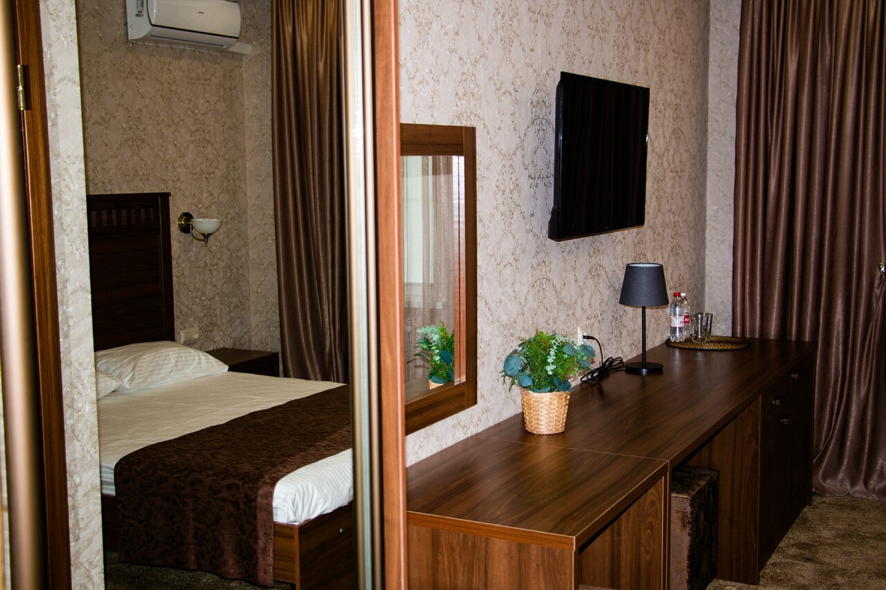 Услуги: — Номера (3000–4000 ₽/ночь) с кондиционером, холодильником, мини-баром, ТВ, Wi-Fi, феном, халатами и тапочками. — Бесплатная парковка, ресторан, сад. — Круглосуточная стойка регистрации, уборка. — Время заезда: 14:00, выезда: 12:00.