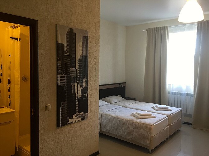 Отель- хостел Спутник порадовал, в первую очередь, чистотой. Реально все идеально чисто. Ремонт новый, свежий, даже не ожидали. Останавливались в 3 вип- номерах 3 семьями. Даже дети отметили, что здесь очень здорово! Есть все: начиная от шампуня, геля, зубной пасты и щетки, заканчивая бесплатным кофе, чаем в кухне и номерах. Очень приветливый администратор. Да и люди, которые останавливаются том, тоже. Это потому что им созданы все условия для отдыха. Единственное неудобство- кафе находится не в здании, а в другом месте, куда надо добираться отдельно. Не посетили. Было не по дороге. Рекомендую всем путешественникам Вид утренней станицы из окна номера на фото.