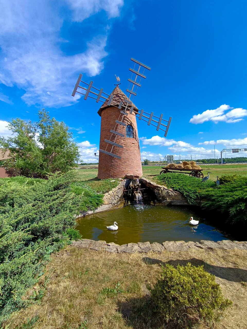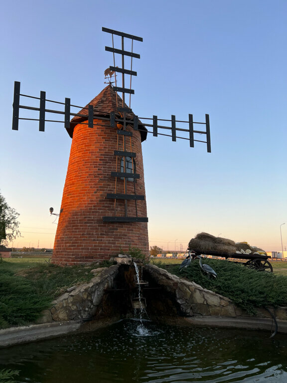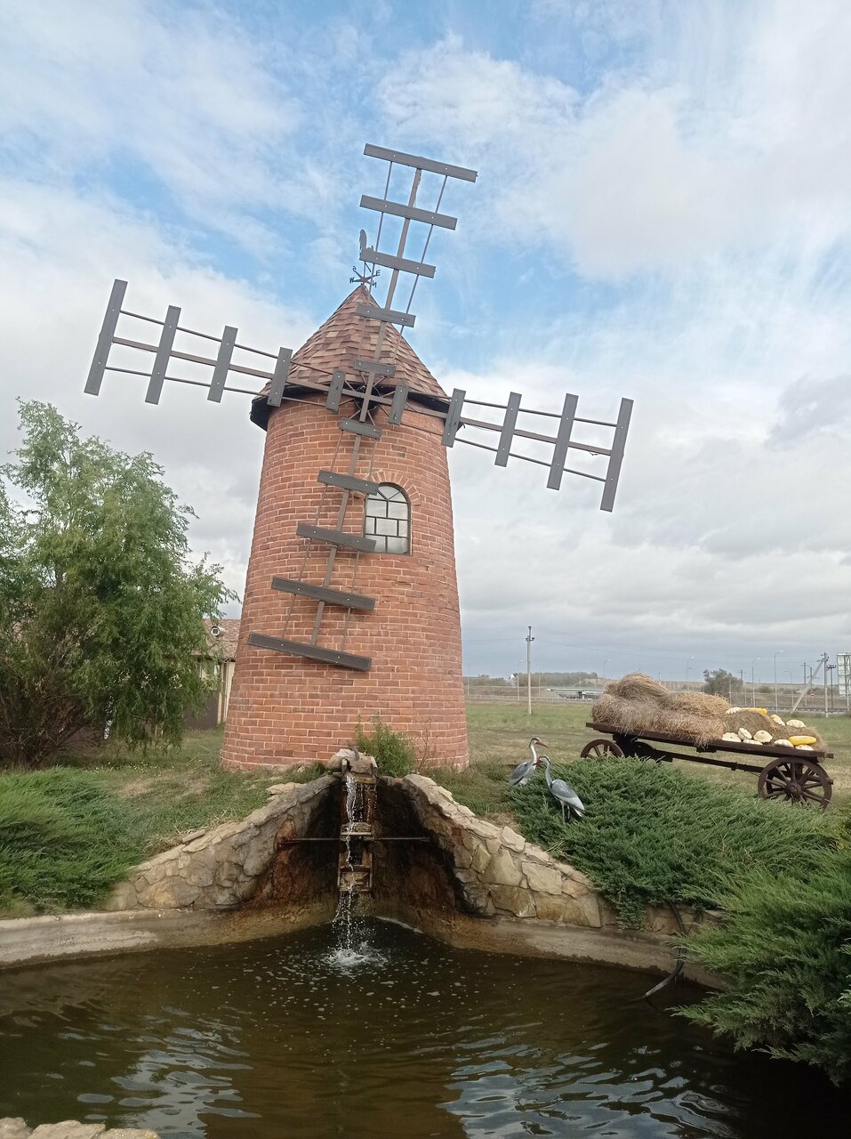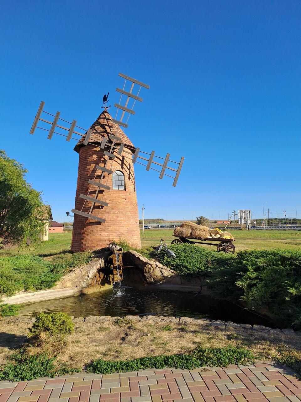 Хороший отель для ночёвки, когда едешь, например, к морю. Бронировали за 3 дня. Номер чистый. Есть чайник в номере, холодильник. На территории есть кафе=столовая. Внутри территория красивая — цветы, экспозиции, лавочки, фонарики, ну, и, конечно, мельница.