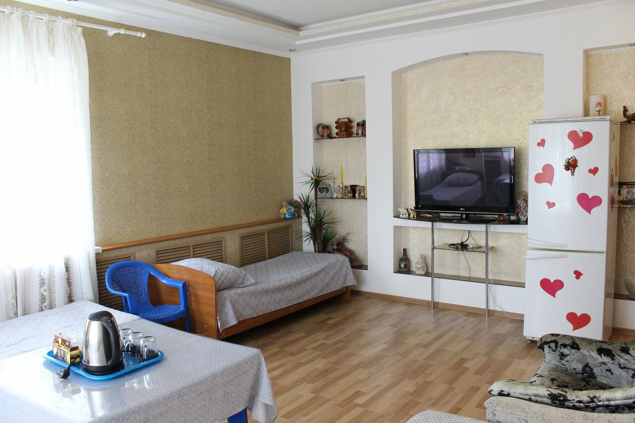 Я так понимаю, что номерной фонд у данных хозяев разный, где-то чисто, ново и красиво, а где-то … ну переночевать нормально. Нам достались ‘апартаменты’ с отдельным входом: 3 кровати, санузел, кондиционер, небольшой холодильник. Всё исправное, но ощущение недомытости. В санузле лежала тряпка хозяйственная, непонятно, что ей мыли, возможно даже и туалет, поэтому побрезговали и трогать не стали, воспользовались своей. По этой же причине не пользовались питьевой водой, чаем, сахаром и посудой. Обеденная группа стоит на улице и очень грязная, прежде чем поужинать, пришлось хорошенько отмыть. Мы были с небольшим животным, поэтому есть сложности в поисках жилья. Но по практике путешествий селят дешевле и в гораздо лучших условиях. Вообщем 5000р. за такую ночевку очень дорого и некомфортно. В следующий раз выберем другой вариант.