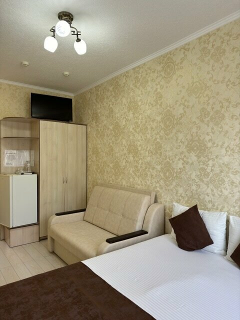 Уютная комната с возможностью размещения 1-го гостя. С доп. местом (двуспальный диван + 500 рублей) Душ, туалет, SMARTTV, холодильник чайник в каждом номере. Парковка бесплатная.
