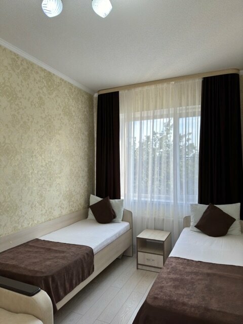 Комната в современном стиле для 2 гостей. Душ, туалет, SMARTTV, холодильник чайник в каждом номере. + Дополнительные места (Двуспальный диван) + 500 рублей. Парковка бесплатно.