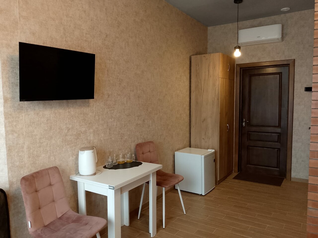 Предоставляет комфортные номера (от 3500 до 6000 ₽/ночь) с кондиционером, Wi-Fi, кухонным уголком, телевизором и санузлом. Доступны услуги парковки, прачечной, ускоренной регистрации. Есть кафе, магазин, детская площадка и бесплатные люльки для малышей.