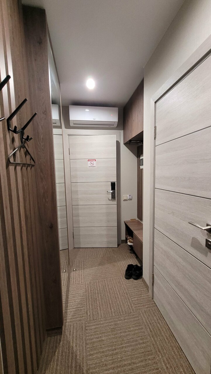 Отличный современный отель, приветливый и внимательный персонал, все новое. Электронный ключ, кондиционер, фен, роль-шторы блэкаут, тапочки, зубные щётки с пастой, гель, шампунь, чай в пакетиках. В коридоре кулер, чайник, кофе машина. В соседнем подъезде Пятёрочка. Ночевали уже второй раз, будем приезжать ещё. Рекомендую !