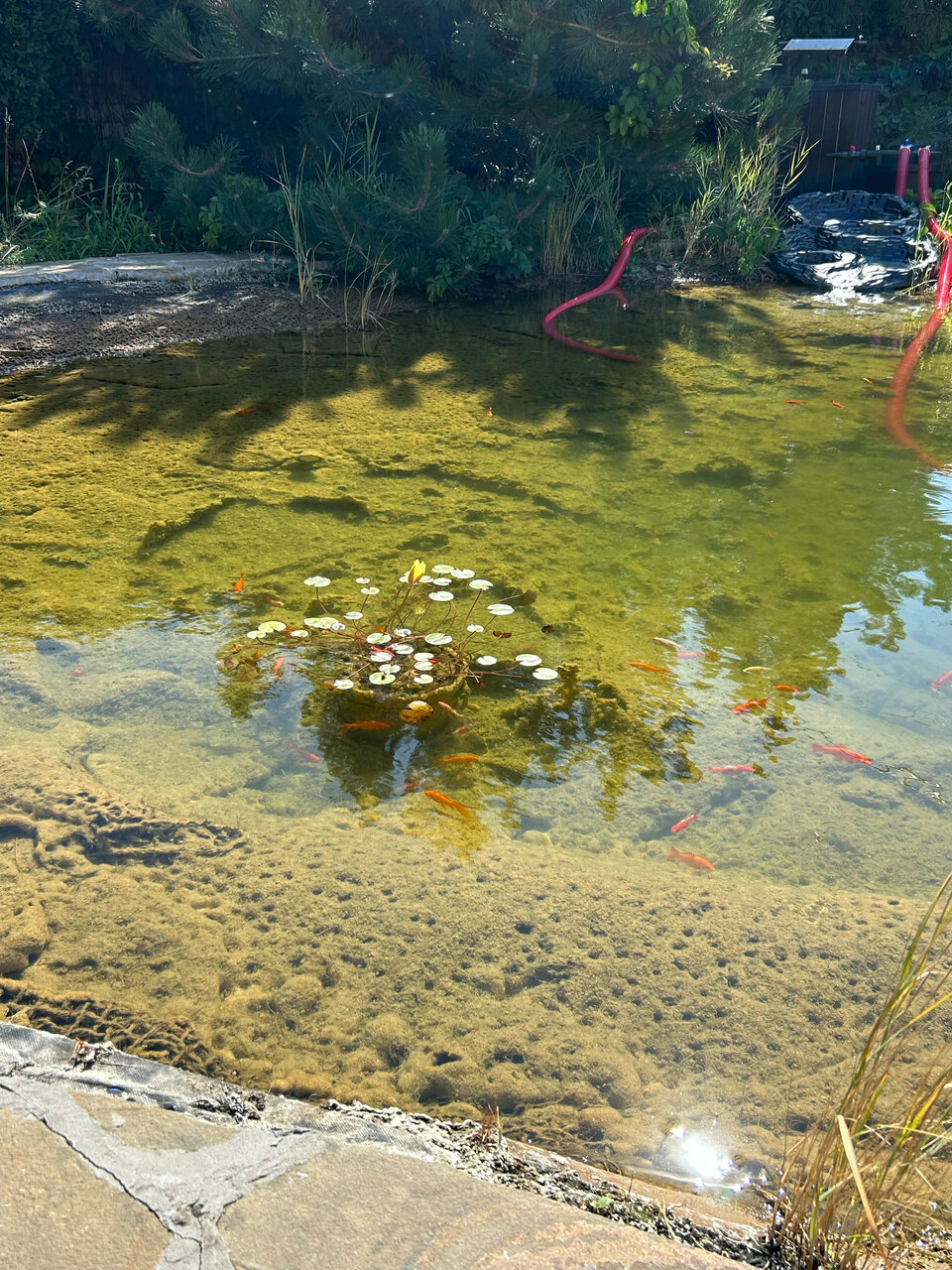 - Наличие пруда с рыбками и качелей.