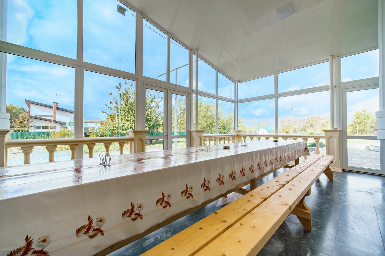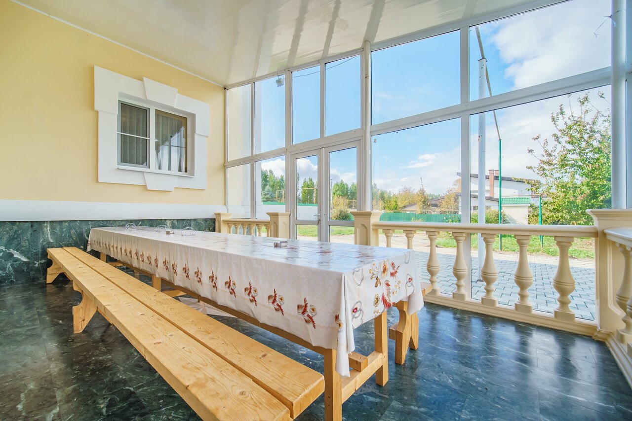 Просторный , уютный дом. Большое посадочное место в кухне, есть все необходимое . Посуда на 20 человек. 5 комнат с кроватями(есть детские) постельное чистое, полотена. За караоке отдельно спасибо большое, голос оставлен в стенах вашего коттеджа. Баня жарит нормально. Бассейн горячий, в холодную погоду нормально. Территория большая, беседка просторная для жарки шашлыка