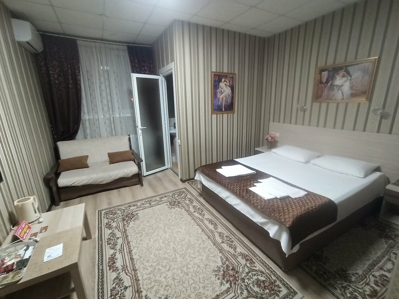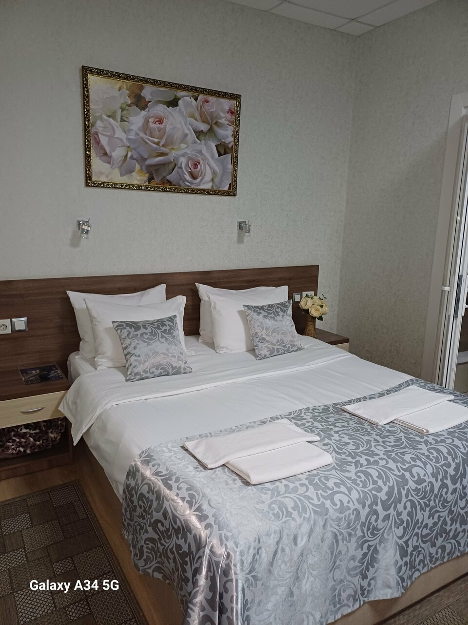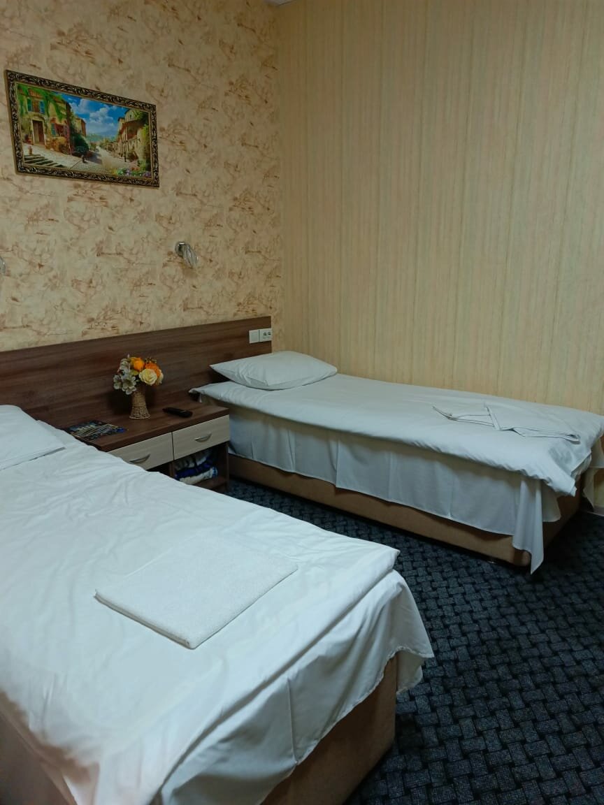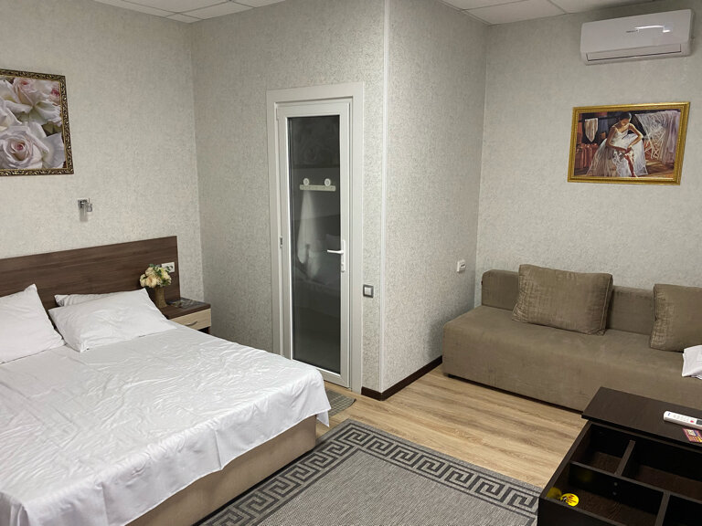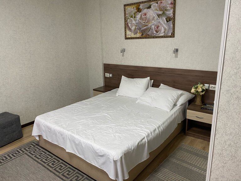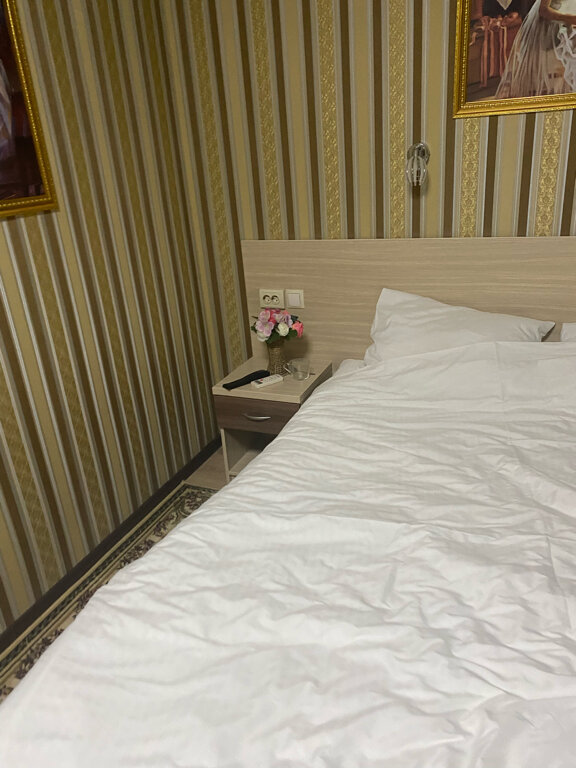 Отель называется Анжелика. Новые, очень чистые и Красивые номера. Мебельный фонд Новый в современном стиле. Мы брали номер на семью из трёх человек. В номере имеется: кондиционер, одна двухспальная кровать, у кровати две прикроватные тумбочкии, над кроватью светильники, раскладной диванчик, телевизор, стол с зеркалом, пуфик, столи на котором находится поднос с тремя кружками и пакетиками чая, постельное белье , полотенце на всех отдельно, комната просторная. В ванной комнате просторно, имеются наборы с зубными щётками и пастами, каждый набор упакован в отдельный пакетик, так же имеются разовые пакетики с гелем для душа и шампунь. На этаже стоит подключённый Куллер с холодной и горячей водой. На территории на заднем дворе отеля есть парковка, на первом этаже имеется круглосуточный магазин. Очень приветливый персонал. Мы остановились в 22-00 и выехали в 9 утра. Отелем остались очень довольны.