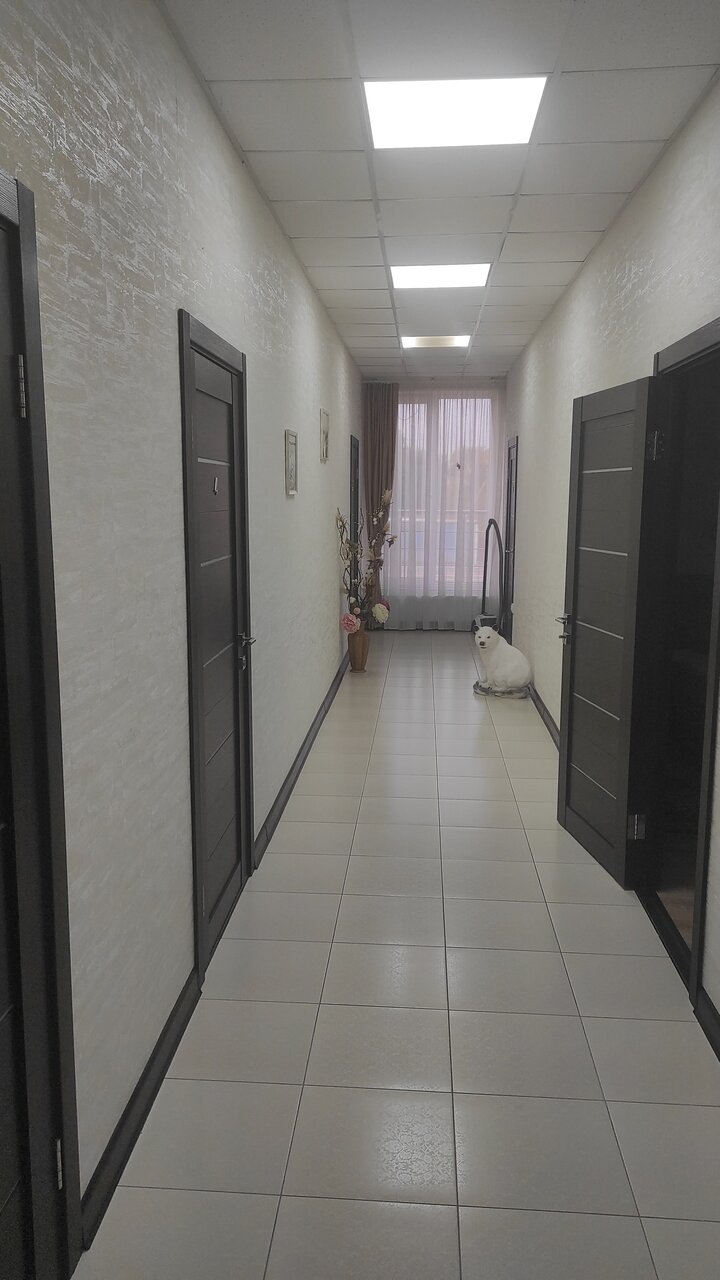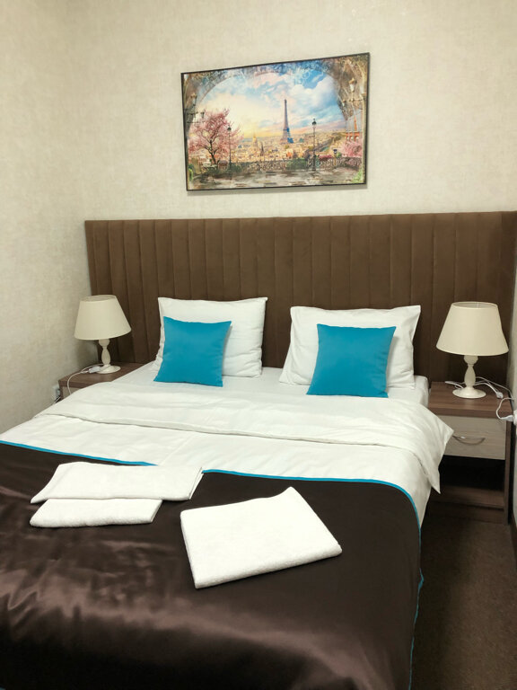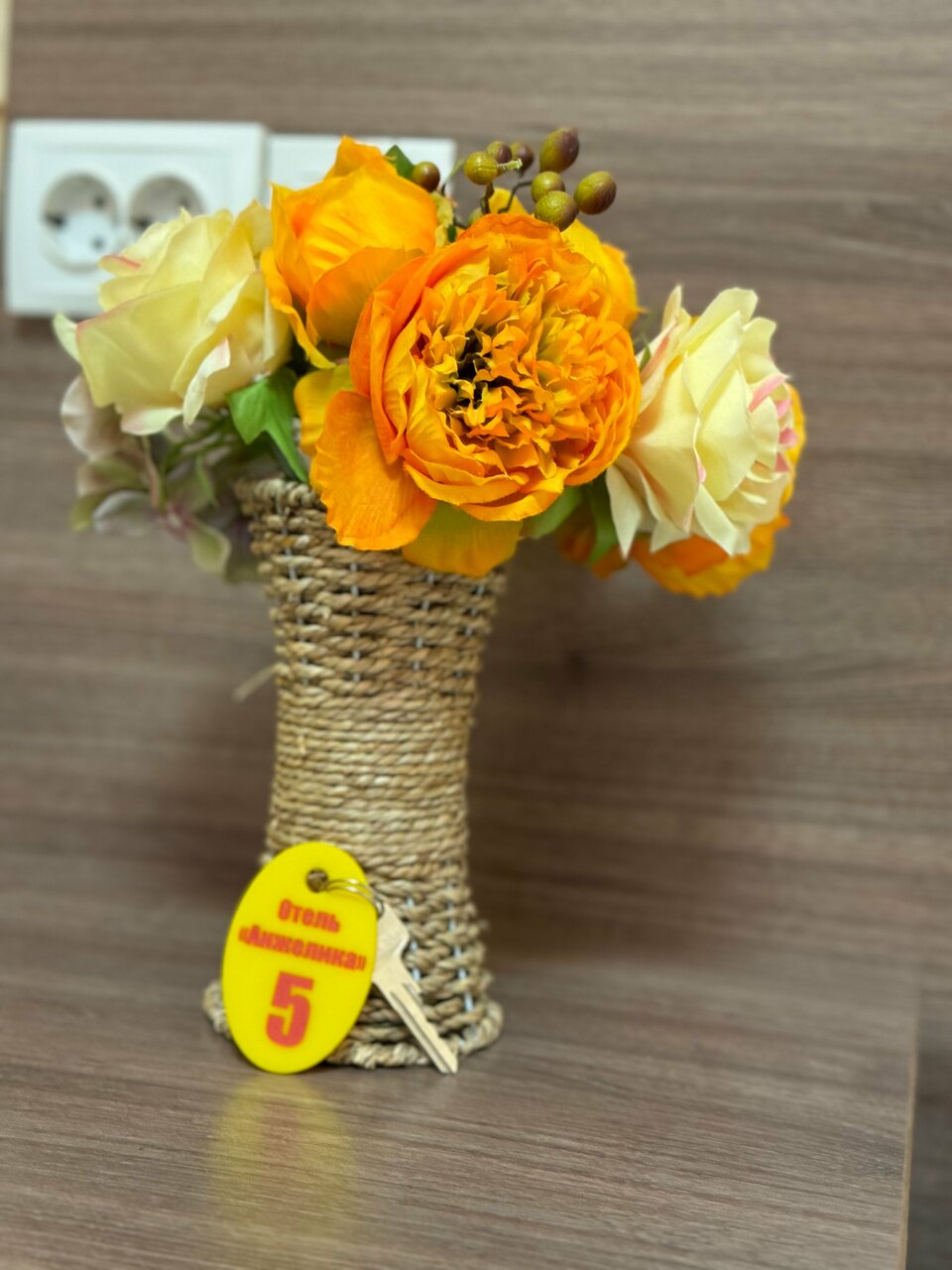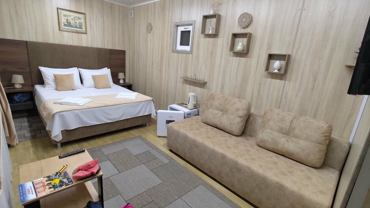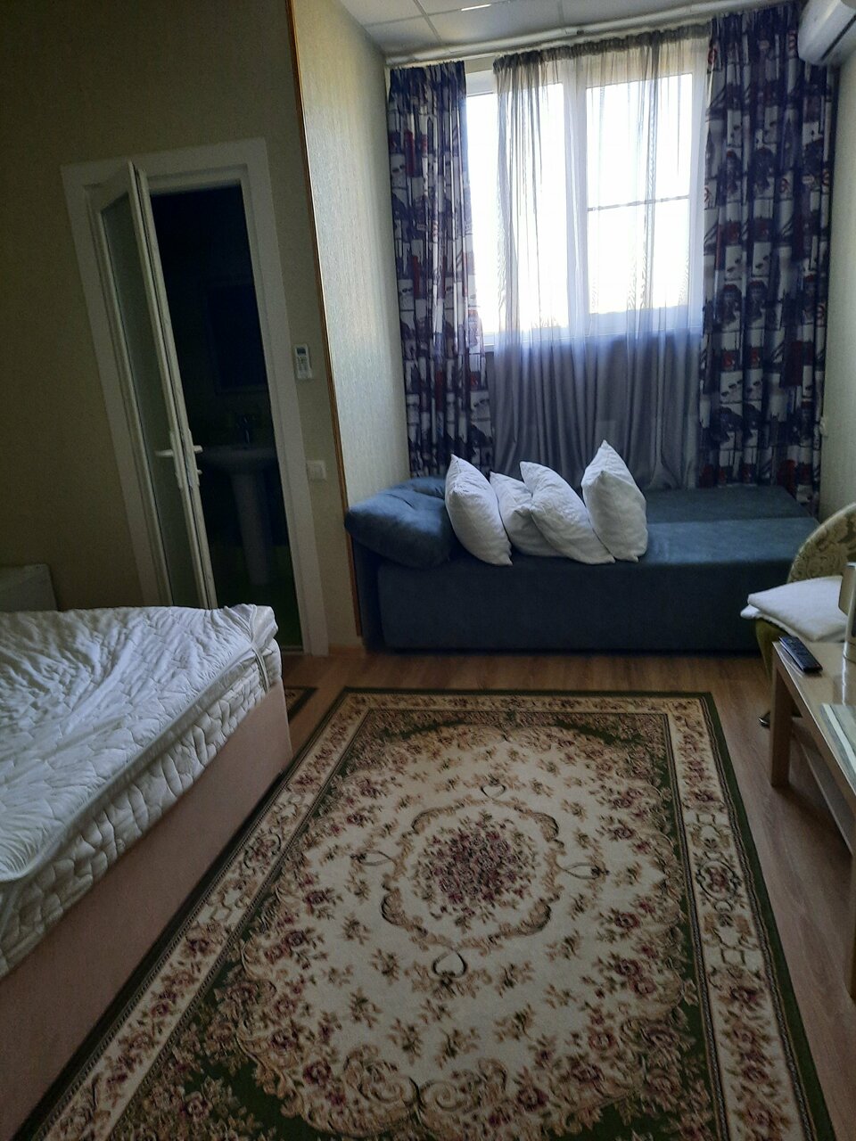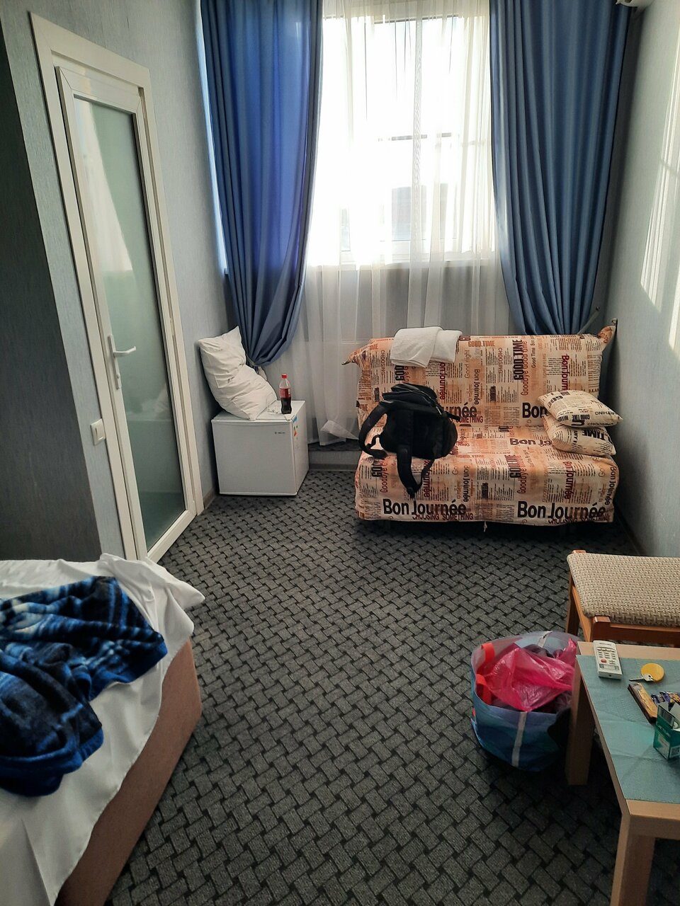Отель называется Анжелика. Новые, очень чистые и Красивые номера. Мебельный фонд Новый в современном стиле. Мы брали номер на семью из трёх человек. В номере имеется: кондиционер, одна двухспальная кровать, у кровати две прикроватные тумбочкии, над кроватью светильники, раскладной диванчик, телевизор, стол с зеркалом, пуфик, столи на котором находится поднос с тремя кружками и пакетиками чая, постельное белье , полотенце на всех отдельно, комната просторная. В ванной комнате просторно, имеются наборы с зубными щётками и пастами, каждый набор упакован в отдельный пакетик, так же имеются разовые пакетики с гелем для душа и шампунь. На этаже стоит подключённый Куллер с холодной и горячей водой. На территории на заднем дворе отеля есть парковка, на первом этаже имеется круглосуточный магазин. Очень приветливый персонал. Мы остановились в 22-00 и выехали в 9 утра. Отелем остались очень довольны.