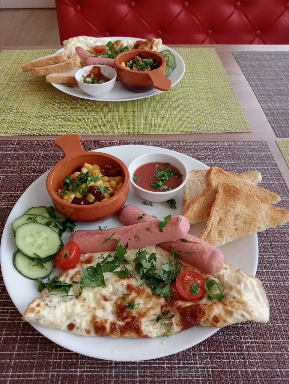Номер чистый, хоть и немного маловат на четверых, но переночевать нормально, есть кондиционер, завтрак неплохой — наесться можно и взрослым и детям.