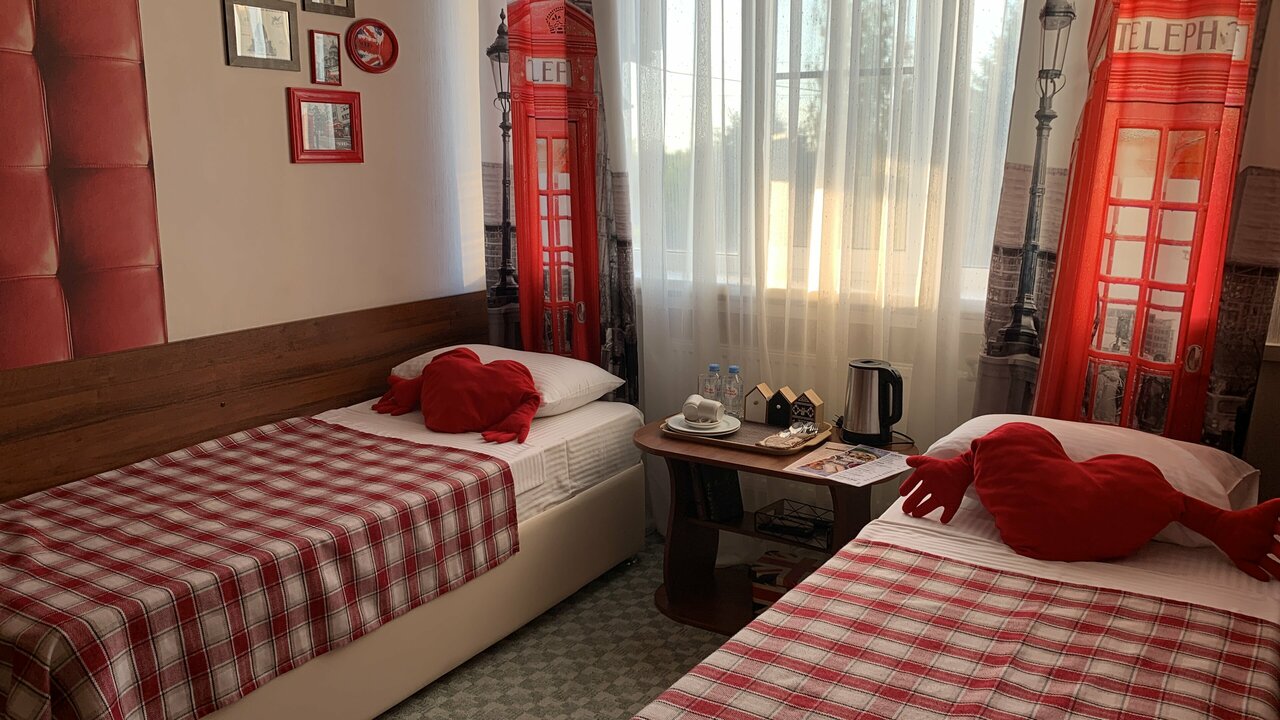 Одна комната с двумя отдельными спальными местами ,душевая кабина и туалет размещены вне номера, в отдельном помещении.