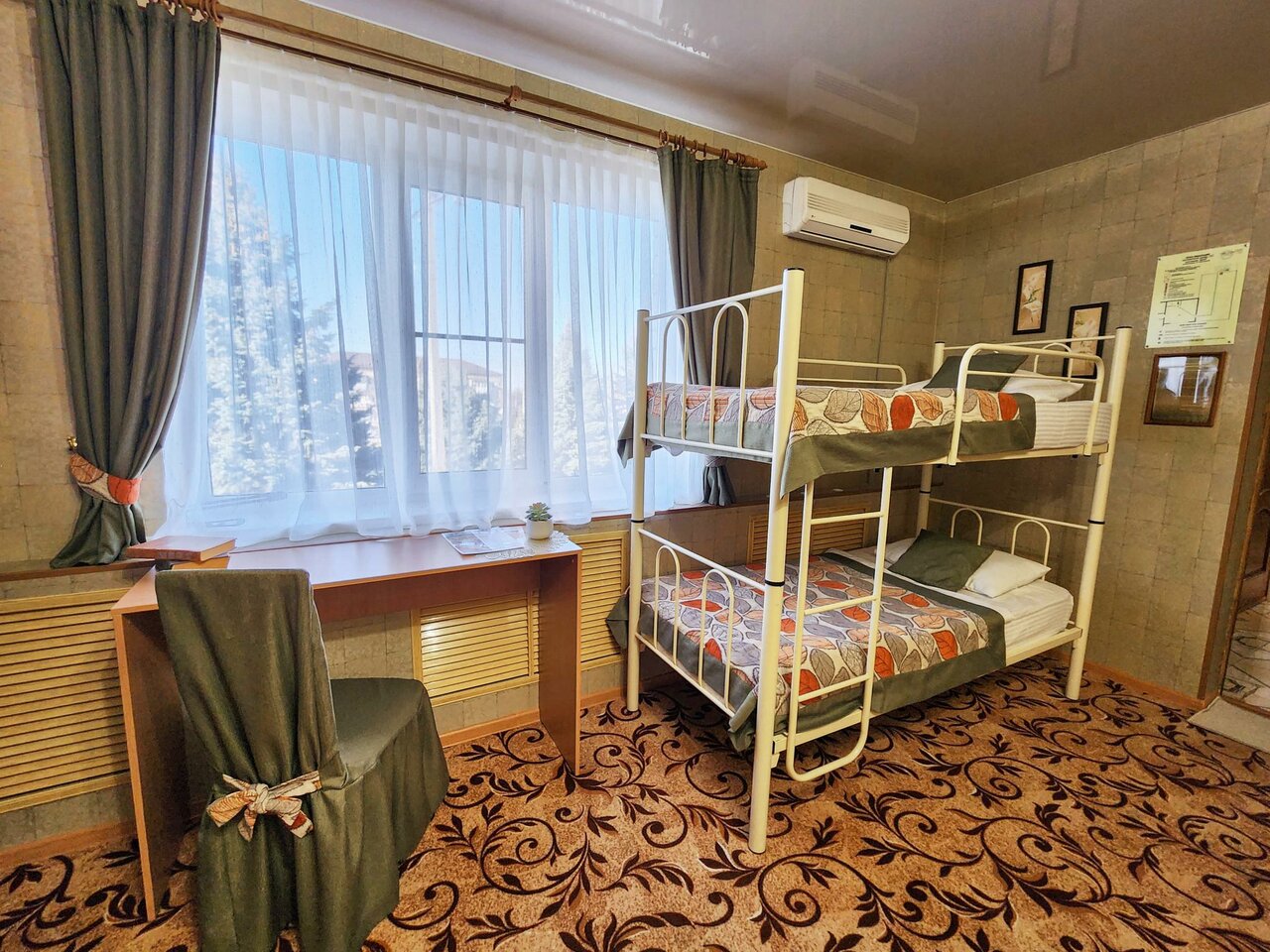Семейный номер с одной двуспальной кроватью и двухъярусной кроватью для детей, с душевой кабиной и санузлом.