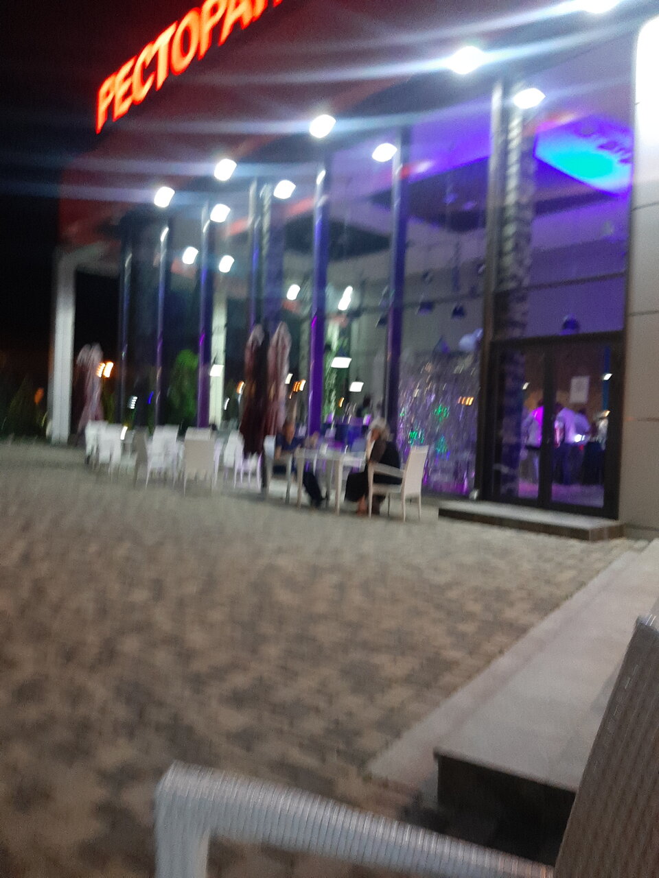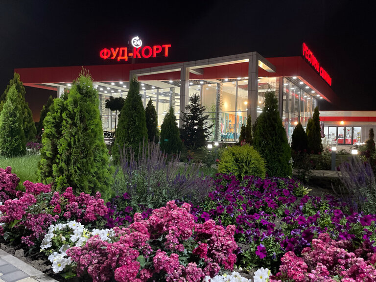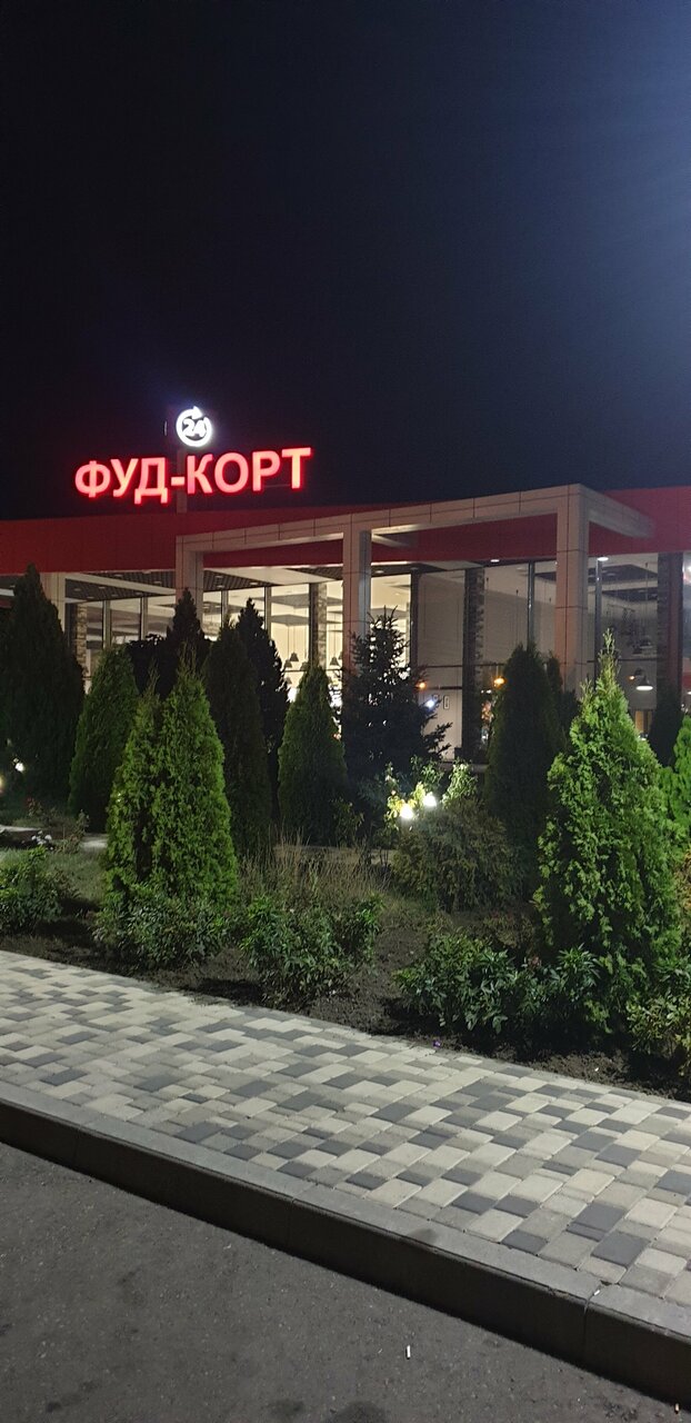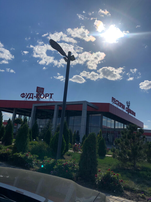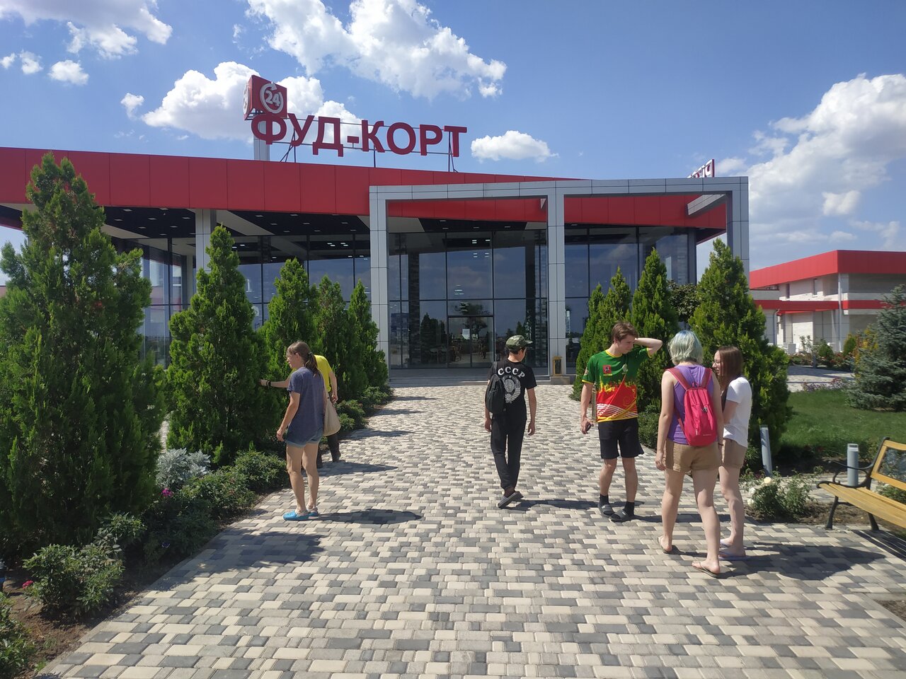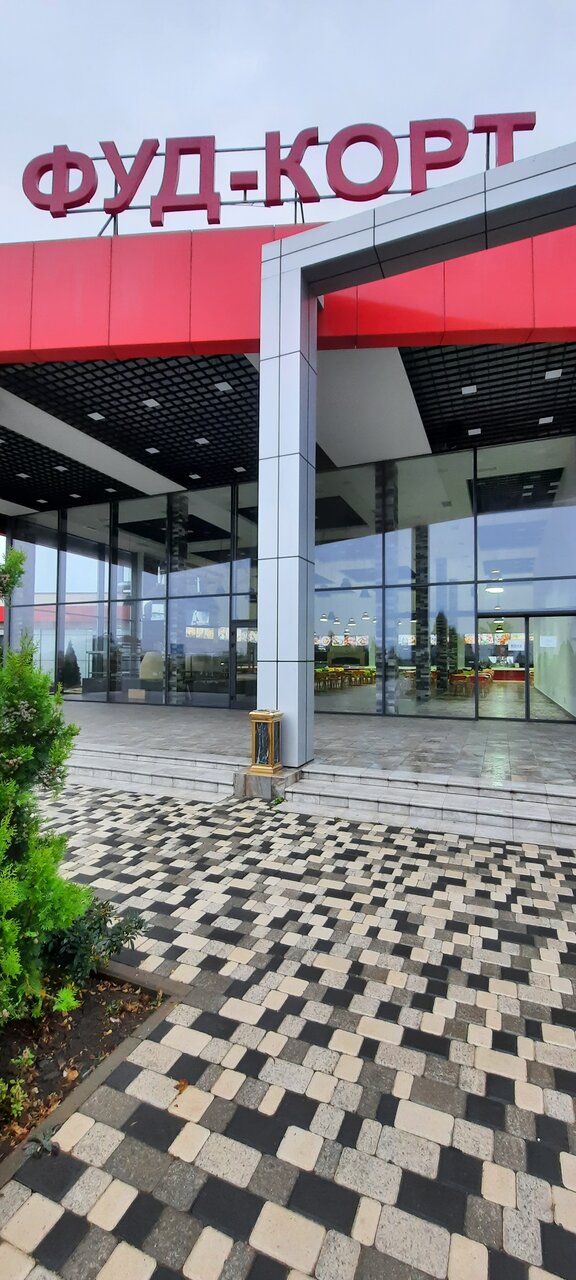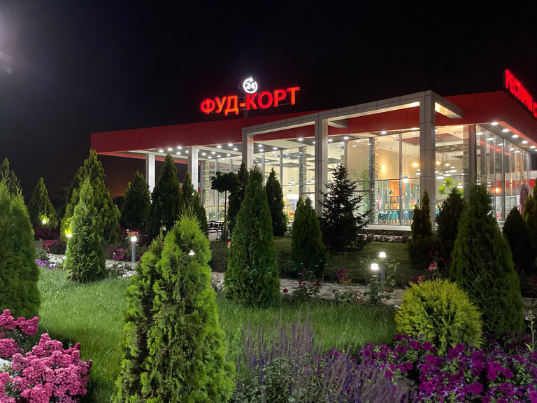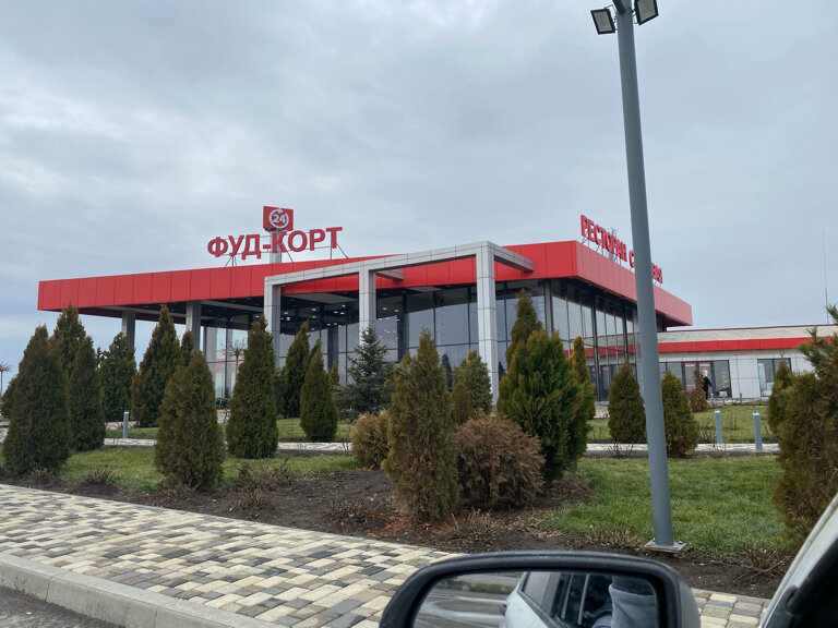 В гостинице не начевал на стоянке стоял.фут корт. Разнообразее блюд и закусок, ценник норм. Все съедобно. Перитория огромная что в нутри что с наружи. Отдохнуть и покушать по дороге к морю самое то.